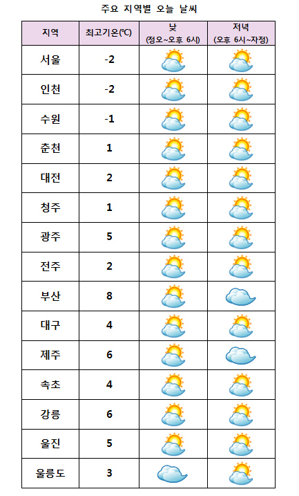 Çѳ· ¼¿ï -2¡É, ´ëÀü¡¤ÀüÁÖ 2¡É, ºÎ»ê 8¡É µî Àü±¹ÀÌ -2¡É¿¡¼ 8¡ÉÀÇ ºÐÆ÷¸¦ º¸À̰ڴÙ.