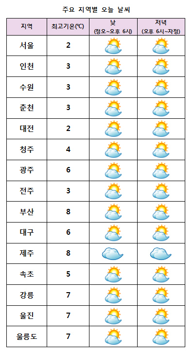 ¿À´Ã ³· ±â¿ÂÀº »çÀ»¡¤´ëÀü 2¡É, ±¤ÁÖ¡¤´ë±¸ 6¡É, ºÎ»ê¡¤Á¦ÁÖ 8¡É µî Àü±¹ÀÌ 2~8¡ÉÀÇ ºÐÆ÷¸¦ º¸À̰ڴÙ.