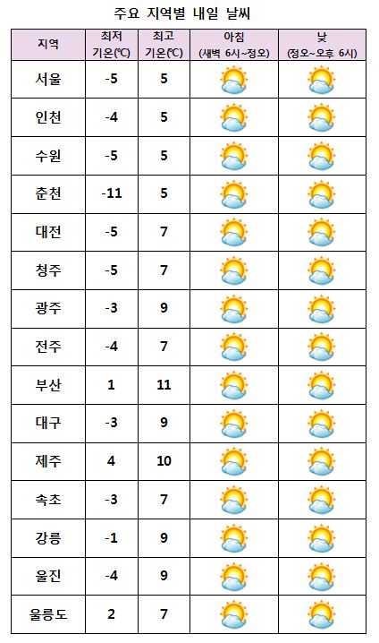 ±Ý¿äÀÏÀÎ ³»ÀÏ(18ÀÏ)Àº Àü±¹ÀÌ ´ëü·Î ¸¼Àº °¡¿îµ¥ ´ë±â°¡ ¸Å¿ì °ÇÁ¶Çϰڰí, ¹Ì¼¼¸ÕÁö ³óµµµµ ³ô°Ô ³ªÅ¸³ª°Ú´Ù. ¹Î°£±â»ó±â¾÷ ÄÉÀÌ¿þ´õ´Â ¡°³»ÀÏ ¿ì¸®³ª¶ó´Â Áß±¹ »óÇØºÎ±Ù¿¡¼ µ¿ÁøÇÏ´Â °í±â¾ÐÀÇ ¿µÇâÀ» ¹Þ¾Æ Àü±¹ÀÌ ´ëü·Î ¸¼°Ú´Ù¡±¸ç ¡°´çºÐ°£ Æò³â°ú ºñ½ÁÇϰųª Á¶±Ý ³ôÀº ±â¿Â ºÐÆ÷¸¦ º¸À̰ÚÀ¸³ª ³»ÀÏ(18ÀÏ) ¾ÆÄ§ ÀϺΠÁߺγ»·ú°ú °æºÏºÏºÎ³»·úÀº -10¡É ÀÌÇÏ·Î ¶³¾îÁö´Â °÷ÀÌ ÀÖ°Ú´Ù¡±°í ¿¹º¸Çß´Ù. ¾ÆÄ§ ÃÖÀú±â¿ÂÀº -11¡É¿¡¼ 4¡É, ³· ÃÖ°í±â¿ÂÀº 5¡É¿¡¼ 11¡É°¡ µÇ°Ú´Ù.