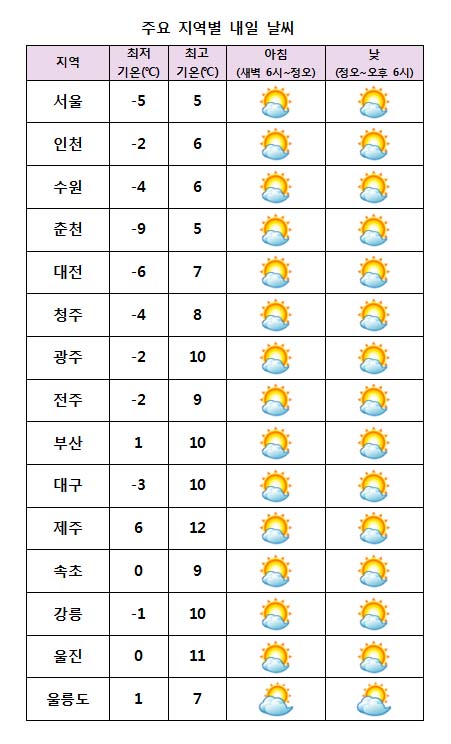 È¿äÀÏÀÎ ³»ÀÏ(22ÀÏ)Àº Àü±¹ÀÌ ´ëü·Î ¸¼Àº °¡¿îµ¥ Çѳ·¿¡ ±â¿ÂÀº Æò³â ¼öÁØÀ» ¿ôµµ´Â °÷µµ ÀÖ°Ú´Ù. ¹Î°£±â»ó±â¾÷ ÄÉÀÌ¿þ´õ´Â ¡°³»ÀÏ ¿ì¸®³ª¶ó´Â Áß±¹ »óÇØºÎ±Ù¿¡ À§Ä¡ÇÑ °í±â¾ÐÀÇ °¡ÀåÀÚ¸®¿¡ µé°Ú´Ù¡±¸ç ¡°Àü±¹ÀÌ ´ëü·Î ¸¼°Ú°í ¿ï¸ªµµ, µ¶µµ´Â ±¸¸§ÀÌ ¸¹°Ú´Ù¡±°í ¿¹º¸Çß´Ù. ¾ÆÄ§ ÃÖÀú±â¿ÂÀº -9¡É¿¡¼ 6¡É, ³· ÃÖ°í±â¿ÂÀº 5¡É¿¡¼ 12¡É°¡ µÇ°Ú´Ù.