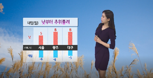 ³»ÀÏ ¾ÆÄ§ ÃÖÀú±â¿ÂÀº ¼¿ï‧±¤ÁÖ -6¡É, ÀÎõ‧´ë±¸ -5¡É, ¼ö¿ø‧´ëÀü‧ûÁÖ -8¡É, Ãáõ -11¡É, ºÎ»ê -2¡É, ¼ÓÃÊ -3¡É, °¸ª -1¡É, Á¦ÁÖ 3¡É°¡ µÇ°Ú°í, ³· ÃÖ°í±â¿ÂÀº ¼¿ï‧ÀÎõ‧¼ö¿ø 5¡É, Ãáõ 4¡É, ´ëÀü 7¡É, ûÁÖ‧ÀüÁÖ 6¡É, ±¤ÁÖ‧´ë±¸‧Á¦ÁÖ‧¼ÓÃÊ 8¡É, °¸ª‧¿ïÁø 11¡É, ºÎ»ê 9¡É°¡ ¿¹»óµÈ´Ù.