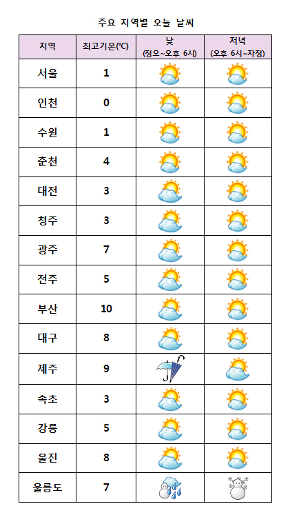 ³· ±â¿ÂÀº ¼¿ï 1¡É, °¸ª¡¤ÀüÁÖ 5¡É, ºÎ»ê 10¡É µî Àü±¹ÀÌ 0~10¡ÉÀÇ ºÐÆ÷¸¦ º¸À̰ڴÙ.