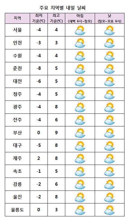 È¿äÀÏÀÎ ³»ÀÏ(12ÀÏ)Àº Àü±¹ÀÌ È帰 °¡¿îµ¥ ÁߺÎÁö¹æ¿¡ »ê¹ßÀûÀ¸·Î ´«¹ßÀÌ ¶³¾îÁú ¶§°¡ ÀÖ°Ú´Ù. ¹Î°£±â»ó±â¾÷ ÄÉÀÌ¿þ´õ´Â ¡°³»ÀÏ ¿ì¸®³ª¶ó´Â Áß±¹ ºÏºÎÁö¹æ¿¡¼ È®ÀåÇÏ´Â °í±â¾ÐÀÇ ¿µÇâÀ» ¹Þ°Ú´Ù¡±¸ç ¡°´ëºÎºÐ Áö¿ª¿¡ ±¸¸§ÀÌ ¸¹Àº °¡¿îµ¥ °¿ø¿µµ¿À» Á¦¿ÜÇÑ ÁߺÎÁö¹æÀº ÇØ±âÂ÷·Î ÀÎÇØ »ý¼ºµÈ ±¸¸§´ëÀÇ ¿µÇâÀ¸·Î »õº®¿¡¼ ¾ÆÄ§»çÀÌ¿¡ È帰 ³¯¾¾¸¦ º¸À̰ڰí, »ê¹ßÀûÀ¸·Î ´«¹ßÀÌ ¶³¾îÁú ¶§°¡ ÀÖ°Ú´Ù¡±°í ¿¹º¸Çß´Ù. ¾ÆÄ§ ÃÖÀú±â¿ÂÀº -8¡É¿¡¼ 2¡É, ³· ÃÖ°í±â¿ÂÀº 3¡É¿¡¼ 9¡É·Î Æò³â°ú ºñ½ÁÇϰųª ±×º¸´Ù ³·Àº ºÐÆ÷¸¦ º¸À̰ڴÙ.