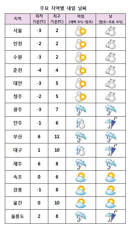 ±Ý¿äÀÏÀÎ ³»ÀÏ(15ÀÏ)Àº °¿ø¿µµ¿À» Á¦¿ÜÇÑ Àü±¹ ´ëºÎºÐ Áö¿ª¿¡ ´« ¶Ç´Â ºñ°¡ ³»¸®°Ú´Ù. ¹Î°£±â»ó±â¾÷ ÄÉÀÌ¿þ´õ´Â ¡°³»ÀÏ ÁߺÎÁö¹æÀº ºÏÂÊÀ» Áö³ª´Â ±â¾Ð°ñÀÇ ¿µÇâÀ» ¹Þ°Ú°í, ³²ºÎÁö¹æÀº Á¦ÁÖµµ ³²ÂÊÇØ»óÀ» Áö³ª´Â ±â¾Ð°ñÀÇ ¿µÇâÀ» ¹Þ°Ú´Ù¡±¸ç ¡°ÁߺÎÁö¹æÀº ¾ÆÄ§ ÇѶ§ ´«ÀÌ ¿À´Ù°¡ ¼Ò°»óŸ¦ º¸À̰ڴ١±°í ¿¹º¸Çß´Ù. ÀÌ¾î ¡°³²ºÎÁö¹æÀº ³· µ¿¾È ºñ ¶Ç´Â ´«ÀÌ ¿À´Â °÷ÀÌ ÀÖ°Ú°í, ÁߺÎÁö¹æÀº ´Ù½Ã Àú³áºÎÅÍ ¹ã»çÀÌ ´«ÀÌ ¿À´Â °÷ÀÌ ÀÖ°Ú´Ù¡±°í ÀüÇß´Ù. * ¿¹»ó °¼ö·® - Àü±¹(°¿ø¿µµ¿ Á¦¿Ü) : 5mm ³»¿Ü * ¿¹»ó Àû¼³ - ¼¿ï¡¤°æ±â, °¿ø¿µ¼, ÃæÃ»µµ, ÀüºÏ, °æºÏ, Á¦ÁÖµµ»êÁö, ¿ï¸ªµµ¡¤µ¶µµ : 1~3cm ¾ÆÄ§ ÃÖÀú±â¿ÂÀº -4¡É¿¡¼ 6¡É, ³· ÃÖ°í±â¿ÂÀº 2¡É¿¡¼ 11¡É°¡ µÇ°Ú´Ù. ³²¼Ç³ÀÌ ºÒ¸é¼ ±â¿ÂÀÌ ¿Ã¶ó Æò³âº¸´Ù 2~5¡É°¡·® ³ô°Ú´Ù.