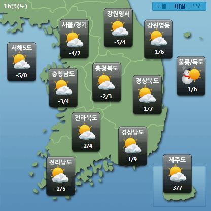 Åä¿äÀÏ ¾ÆÄ§ ±â¿ÂÀº Àü±¹ÀÌ -9¡É¿¡¼ 2¡É·Î Æò³â°ú ºñ½ÁÇϰÚÀ¸³ª ³· ±â¿ÂÀº 2¡É¿¡¼ 8¡É·Î Æò³âº¸´Ù 2~3¡É°¡·® ³·°Ú´Ù. ¶ÇÇÑ ¹Ù¶÷ÀÌ ´Ù¼Ò °ÇÏ°Ô ºÒ¾î ü°¨¿Âµµ°¡ ³·°Ú´Ù.