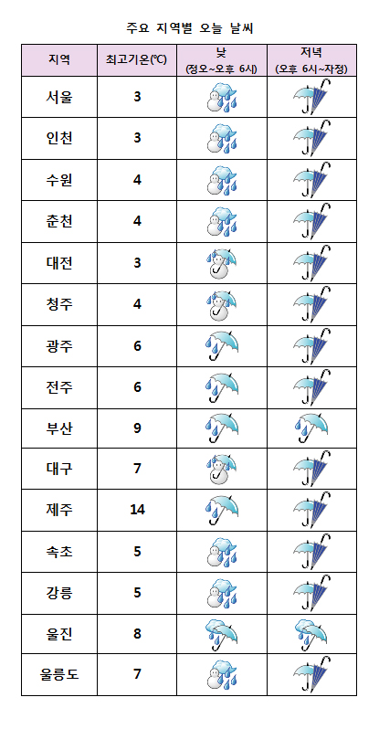 È¿äÀÏÀÎ ³»ÀÏ(18ÀÏ)Àº Àü±¹ÀÌ È帰 °¡¿îµ¥ ´ëºÎºÐ Áö¿ª¿¡ ÇѶ§ ºñ ¶Ç´Â ´«ÀÌ ³»¸®°Ú´Ù. ¹Î°£±â»ó±â¾÷ ÄÉÀÌ¿þ´õ´Â ¡°³»ÀÏ ¿ì¸®³ª¶ó´Â Àü±¹ÀÌ ´ëü·Î ¸¼Àº °¡¿îµ¥ ³²ÇØ»óÀ» Áö³ª´Â Àú±â¾ÐÀÇ ¿µÇâÀ» ¹Þ°Ú´Ù¡±¸ç ¡°Àü±¹ÀÌ È帮°í Àü¶óµµ¿Í °æ³², Á¦ÁÖµµ¿¡ ºñ°¡ ½ÃÀ۵Š»õº®ºÎÅÍ ¾ÆÄ§»çÀÌ ±× ¹ÛÀÇ Áö¹æÀ¸·Î È®´ëµÇ°Ú´Ù¡±°í ¿¹º¸Çß´Ù. ÀÌ¾î ¡°ÁߺÎÁö¹æ, °æºÏ³»·úÀº ´«ÀÌ ³»¸®´Â °÷µµ ÀÖ°Ú´Ù¡±¸ç ¡°Àü±¹ °÷°÷¿¡ ³»¸®´Â ºñ³ª ´«Àº ´ÊÀº ¿ÀÈÄ ¼ÇؾȺÎÅÍ ±×Ä¡±â ½ÃÀÛÇØ ¹ã¿¡´Â Àü±¹ ´ëºÎºÐ ±×Ä¡°Ú´Ù¡±°í ¿¹º¸Çß´Ù. * ¿¹»ó °¼ö·®(19ÀÏ) - ³²ÇؾÈ, Á¦ÁÖµµ : 30~60mm(¸¹Àº °÷ Á¦Áֻ갣 120mmÀÌ»ó) - ³²ºÎÁö¹æ(³²ÇØ¾È Á¦¿Ü), ÃæÃ»³²ºÎ : 10~30mm - ¼¿ï.°æ±âµµ, °¿øµµ, ÃæÃ»ºÏºÎ : 5~10mm * ¿¹»ó Àû¼³(19ÀÏ) - ¼¿ï.°æ±âµµ, °¿ø¿µ¼ : 3~8cm - ÃæÃ»µµ, °æºÏ³»·ú : 1~5cm - °¿ø¿µµ¿ : 1cm ¹Ì¸¸ ¾ÆÄ§ ÃÖÀú±â¿ÂÀº -2¡É¿¡¼ 8¡É, ³· ÃÖ°í±â¿ÂÀº 3¡É¿¡¼ 14¡É°¡ µÇ°Ú´Ù. ³»ÀÏ(19ÀÏ) ¾ÆÄ§±îÁö´Â ³²¼Ç³ÀÌ À¯ÀÔµÇ¸é¼ ±â¿ÂÀÌ ¿Ã¶ó Æò³â°ú ºñ½ÁÇϰųª Á¶±Ý ³ô°Ú´Ù.