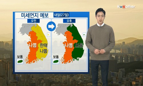 ³¯Àº Ç®¸®°í ÀÖÁö¸¸ ¿¬ÀÏ ¹Ì¼¼¸ÕÁö ¼öÄ¡°¡ ³ô°Ô ³ªÅ¸³ª°í ÀÖ´Ù. ´Ù¸¸, ³»ÀÏ(27ÀÏ‧¼ö) µ¿ÂÊÁö¿ªÀÇ ¹Ì¼¼¸ÕÁö ³óµµ´Â ¿À´Ãº¸´Ù ³óµµ°¡ ¿¶¾îÁö°Ú´Ù. ³»ÀÏ Ãʹ̼¼¸ÕÁö ³óµµ´Â ¼ÂÊ Áö¿ªÀ¸·Î´Â ¡®³ª»Ý¡¯ ´Ü°è, °¿øµµ°ú °æ»óµµ Áö¿ªÀ¸·Î´Â ¿ÀÀü±îÁö ¡®ÇѶ§ ³ª»Ý¡¯ ¼öÁØÀ» º¸ÀÌ´Ù°¡ ¿ÀÈÄ µé¾î¼´Â ¡®º¸Å롯 ´Ü°è¸¦ ȸº¹ ÇÒ °ÍÀ¸·Î º¸ÀδÙ. ¿ÀÀü±îÁö´Â Ãʹ̼¼¸ÕÁö ³óµµ°¡ ³ôÀ¸´Ï Ãâ±Ù ½Ã¿¡ ¹Ì¼¼¸ÕÁö¿ë ¸¶½ºÅ©¸¦ ²À ì±â±â ¹Ù¶õ´Ù. ¹Î°£±â»ó±â¾÷ ÄÉÀÌ¿þ´õ´Â ¡°³»ÀÏ(27ÀÏ‧¼ö) Àº µ¿ÇØ»ó¿¡ À§Ä¡ÇÑ °í±â¾ÐÀÇ ¿µÇâÀ» ¹Þ´Ù°¡ Á¡Â÷ ±× °¡ÀåÀÚ¸®¿¡ µé°Ú´Ù¡±°í ÀüÇß´Ù. ÄÉÀÌ¿þ´õ ¿¹º¸ °ü°èÀÚ´Â ¡°ÇöÀç Àü±¹ÀÌ ´ëü·Î ¸¼Àº ³¯¾¾¸¦ º¸À̰í ÀÖ´Ù¡±°í ¸»Çß´Ù. * (ÃÊ)¹Ì¼¼¸ÕÁö ¿¹º¸ - ȯ°æºÎ ±âÁØ : Áß¼ºÎ, Àü¶óµµ ¡®³ª»Ý¡¯ / °¿øµµ, °æ»óµµ ¿ÀÀü ¡®ÇѶ§ ³ª»Ý¡¯ ¿ÀÈÄ ¡®º¸Å롯/ Á¦ÁÖµµ ¡®º¸Å롯 - WHO ±âÁØ : Áß¼ºÎ, Àü¶óµµ ¡®¸Å¿ì ³ª»Ý¡¯ / °¿øµµ, °æ»óµµ ¿ÀÀü ¡®³ª»Ý¡¯ ¿ÀÈÄ ¡®ÇѶ§ ³ª»Ý¡¯/ Á¦ÁÖµµ ¡®ÇѶ§ ³ª»Ý¡¯ ¾ÆÄ§ ÃÖÀú±â¿ÂÀº ¼¿ï 2¡É, ÀÎõ‧¼ö¿ø 1¡É, Ãáõ -1¡É, ´ëÀü 2¡É, ûÁÖ‧ÀüÁÖ 3¡É, ±¤ÁÖ 4¡É, ºÎ»ê 8¡É, ´ë±¸‧°¸ª 3¡É, Á¦ÁÖ 7¡É, ¼ÓÃÊ 4¡É, °¸ª 3¡É, ¿ïÁø 6¡É, ¿ï¸ªµµ 5¡É¸¦ º¸À̰ڴÙ. ³· ÃÖ°í±â¿ÂÀº ¼¿ï 11¡É, ÀÎõ 10¡É, ¼ö¿ø‧Ãáõ 12¡É, ´ëÀü‧ûÁÖ 13¡É, ±¤ÁÖ‧ÀüÁÖ‧ºÎ»ê 14¡É, ´ë±¸ 13¡É, Á¦ÁÖ 15¡É, ¼ÓÃÊ 10¡É, °¸ª 11¡É, ¿ïÁø 12¡É, ¿ï¸ªµµ 9¡É, ¹é·Éµµ 5¡É°¡ ¿¹»óµÈ´Ù. ³²ÇØ»óÀ¸·Î´Â È帰 °¡¿îµ¥ ¹Ù´ÙÀÇ ¹°°áÀº ¼ÇØ¿Í ³²ÇØ ÃÖ°í 2m, µ¿ÇØ»óÀ¸·Î´Â ÃÖ°í 2.5m·Î ¾à°£ ³ô°Ô ÀϰڴÙ. Ç×ÇØ³ª Á¶¾÷ÇÏ´Â ¼±¹ÚÀº Âü°íÇϱ⠹ٶõ´Ù. ¸ð·¹(28ÀÏ) ¸ñ¿äÀÏ¿¡´Â Àü³²°ú °æ³² ±×¸®°í Á¦ÁÖµµ¿¡ ºñ ¼Ò½ÄÀÌ ÀÖ´Ù. ÁÖ¸»ÀÎ Åä¿äÀÏ(3¿ù 2ÀÏ)¿¡µµ Àü³²ÇؾȰú Á¦ÁÖµµ¿¡ ºñ°¡ ³»¸®±â ½ÃÀÛÇØ ÀÏ¿äÀÏ(3¿ù 3ÀÏ)¿¡´Â Àü±¹À¸·Î È®´ë µÉ °ÍÀ¸·Î Àü¸ÁµÈ´Ù.