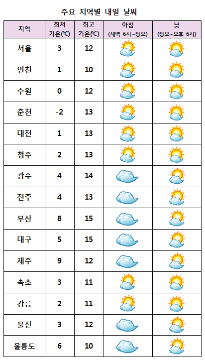 ¾ÆÄ§ ÃÖÀú±â¿ÂÀº -2¡É¿¡¼ 9¡É, ³· ÃÖ°í±â¿ÂÀº 10¡É¿¡¼ 15¡É°¡ µÇ°Ú´Ù. ¹Ì¼¼¸ÕÁö ³óµµ´Â Áß¼ºÎ, °¿ø¿µ¼, ÀüºÏ ¿ÀÀü ¡®º¸Åë ¡® ¿ÀÈÄ ¡®³ª»Ý¡¯, ±× ¹ÛÀÇ Àü±¹Àº ¿ÀÀü ¡®º¸Åë¡®, ¿ÀÈÄ ¡®ÇѶ§ ³ª»Ý¡® ´Ü°è¸¦ º¸À̰ڴÙ. Ãʹ̼¼¸ÕÁö ³óµµ´Â Áß¼ºÎ, °¿ø¿µ¼, Àü¶óºÏµµ´Â ¡®³ª»Ý¡¯, Àü¶ó³²µµ¿Í °æ»óµµ´Â ¿ÀÀü ¡®º¸Å롯, ¿ÀÈÄ ¡®ÇѶ§ ³ª»Ý¡¯, ±× ¹ÛÀÇ Àü±¹Àº ¡®º¸Å롯 ´Ü°è°¡ µÇ°Ú´Ù. ³»ÀÏ Á¦ÁÖµµÀüÇØ»ó°ú ³²Çظչٴٿ¡¼ ¹Ù¶÷ÀÌ 9~14m/s(32~50km/h)·Î °ÇÏ°Ô ºÒ°í ¹°°áÀÌ 1.5~3m·Î ³ô°Ô ÀϰڴÙ. ÇÑÆí À̹ø ÁÖ´Â ±â¾Ð°ñÀÇ ¿µÇâÀ¸·Î 2ÀÏ¿¡´Â Àü³²ÇؾÈ, Á¦ÁÖµµ¿¡, 3ÀÏÀº ÃæÃ»À̳²¿¡ ºñ ¶Ç´Â ´«ÀÌ ¿À°Ú´Ù. ±× ¹ÛÀÇ ³¯Àº °í±â¾ÐÀÇ ¿µÇâÀ¸·Î °¡²û ±¸¸§ÀÌ ¸¹°Ú´Ù.