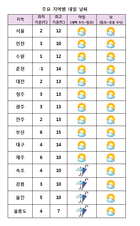 ¸ñ¿äÀÏÀÎ ³»ÀÏ(7ÀÏ)Àº °¿øµµ¿Í ÃæºÏ, °æºÏ µî ÀϺÎÁö¿ª¿¡ ¾ÆÄ§±îÁö ºñ°¡ ¿À´Â °÷ÀÌ ÀÖ°Ú°í, ¹Ì¼¼¸ÕÁö ³óµµ°¡ ¡®º¸Å롯 ¼öÁØÀ» º¸À̰ڴÙ. ¹Î°£±â»ó±â¾÷ ÄÉÀÌ¿þ´õ´Â ¡°³»ÀÏ ¿ì¸®³ª¶ó´Â Áß±¹ ºÏºÎÁö¹æ¿¡¼ ³²µ¿ÁøÇÏ´Â °í±â¾ÐÀÇ ¿µÇâÀ» Á¡Â÷ ¹Þ°Ú´Ù¡±¸ç ¡°Àü±¹ÀÌ ´ëü·Î ¸¼°ÚÀ¸³ª °¿øµµ¿Í ÃæºÏºÎºÎ, °æºÏºÏºÎ¿¡´Â ¾ÆÄ§±îÁö ´« ¶Ç´Â ºñ°¡ ¿À´Â °÷ÀÌ ÀÖ°Ú´Ù¡±°í ¿¹º¸Çß´Ù. ¾ÆÄ§ ÃÖÀú±â¿ÂÀº -1¡É¿¡¼ 6¡É, ³· ÃÖ°í±â¿ÂÀº 7¡É¿¡¼ 15¡É°¡ µÇ°Ú´Ù. ³»ÀÏ(7ÀÏ)±îÁö ¾ÆÄ§ ±â¿ÂÀº Æò³âº¸´Ù 3~5¡É °¡·® ³ô°ÚÀ¸³ª, ³»·úÀ» Áß½ÉÀ¸·Î ³·°ú ¹ãÀÇ ±â¿ÂÂ÷°¡ 10¡É ÀÌ»ó Å©°Ú´Ù. * ¿¹»ó °¼ö·®(6~7ÀÏ) - °¿ø¿µµ¿(~7ÀϱîÁö) : 5~20mm - °¿ø¿µ¼, ÃæºÏºÏºÎ, °æºÏºÏºÎ(7ÀÏ) : 5mm ¹Ì¸¸ * ¿¹»ó Àû¼³(6~7ÀÏ) - °¿ø»ê°£ : 5~20cm - °¿ø¿µµ¿ : 1~3cm - °¿ø¿µ¼, ÃæºÏ, °æºÏºÏºÎ(7ÀÏ) : 1cm ³»¿Ü