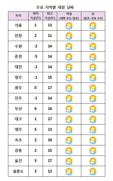 ±Ý¿äÀÏÀÎ ³»ÀÏ(8ÀÏ)Àº Àü±¹ÀÌ ´ëü·Î ¸¼Àº °¡¿îµ¥ ¹Ì¼¼¸ÕÁö´Â ¡®º¸Å롯 ¼öÁØÀ» º¸À̰ڰí, Ãʹ̼¼¸ÕÁö ³óµµ´Â ÀϺΠÁö¿ª¿¡¼ ÇѶ§ ¡®³ª»Ý¡¯ ´Ü°è°¡ µÇ°Ú´Ù. ¹Î°£±â»ó±â¾÷ ÄÉÀÌ¿þ´õ´Â ¡°³»ÀÏ ¿ì¸®³ª¶ó´Â ¼Çػ󿡼 µ¿ÁøÇÏ´Â °í±â¾ÐÀÇ ¿µÇâÀ» ¹Þ¾Æ Àü±¹ÀÌ ´ëü·Î ¸¼°Ú´Ù¡±¸ç ¡°¾ÆÄ§¿¡ º¹»ç³Ã°¢À¸·Î ÀÎÇØ ±â¿ÂÀÌ ¿À´Ãº¸´Ù ³·¾ÆÁö¸é¼ ³»·úÀ» Áß½ÉÀ¸·Î Àϱ³Â÷°¡ Å©°Ú´Ù¡±°í ¿¹º¸Çß´Ù. ¾ÆÄ§ ÃÖÀú±â¿ÂÀº -5¡É¿¡¼ 6¡É, ³· ÃÖ°í±â¿ÂÀº 11¡É¿¡¼ 17¡É°¡ µÇ°Ú´Ù.