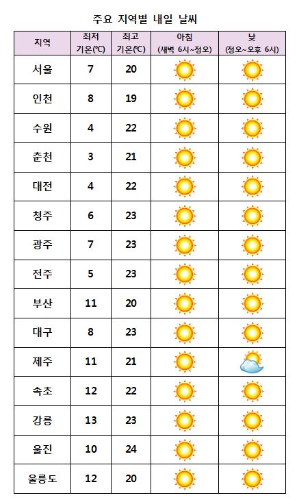 ¾ÆÄ§ ÃÖÀú±â¿ÂÀº 1¡É¿¡¼ 13¡É, ³· ÃÖ°í±â¿ÂÀº 19¡É¿¡¼ 24¡É°¡ µÇ°Ú´Ù. µû¶æÇÑ ¼Ç³°è¿ÀÇ ¹Ù¶÷ÀÌ À¯ÀÔµÇ¸é¼ Æò³â°ú ºñ½ÁÇϰųª ³ôÀº ±â¿ÂºÐÆ÷¸¦ º¸À̰ڴÙ.