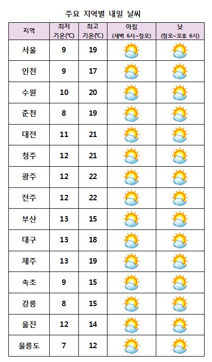 ±Ý¿äÀÏÀÎ ³»ÀÏ(19ÀÏ)Àº Àü±¹ÀÌ ´ëü·Î ¸¼Àº ³¯¾¾¸¦ º¸À̰ÚÀ¸³ª ÃæÃ»À̳²Áö¹æÀÇ ¹Ì¼¼¸ÕÁö ³óµµ°¡ ¿ÀÀü¿¡ ¡®ÇѶ§ ³ª»Ý¡¯ ´Ü°è·Î ³ªÅ¸³ª°Ú´Ù. ¹Î°£±â»ó±â¾÷ ÄÉÀÌ¿þ´õ´Â ¡°³»ÀÏ ¿ì¸®³ª¶ó´Â Áß±¹ ºÏµ¿Áö¹æ¿¡¼ ³²µ¿ÁøÇÏ´Â °í±â¾ÐÀÇ °¡ÀåÀÚ¸®¿¡ µé°Ú´Ù¡±¸ç ¡°Áß¼ºÎ´Â ´ëü·Î ¸¼°Ú°í, °¿øµµ, ³²ºÎÁö¹æÀº Á¡Â÷ ¸¼¾ÆÁö°Ú´Ù¡±°í ¿¹º¸Çß´Ù. ¾ÆÄ§ ÃÖÀú±â¿ÂÀº 7¡É¿¡¼ 13¡É, ³· ÃÖ°í±â¿ÂÀº 12¡É¿¡¼ 22¡É°¡ µÇ°Ú´Ù. ´çºÐ°£ Æò³âº¸´Ù ³ôÀº ±â¿ÂºÐÆ÷¸¦ º¸À̰ÚÀ¸³ª, ³·°ú ¹ãÀÇ ±â¿ÂÂ÷°¡ Å©°Ú´Ù.