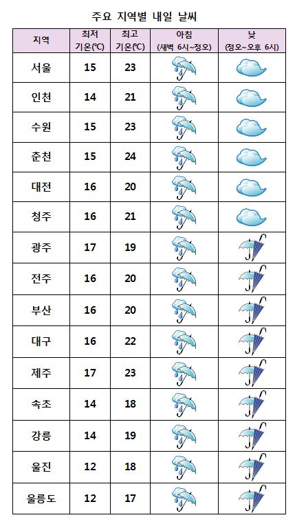 ¼ö¿äÀÏÀÎ ³»ÀÏ(24ÀÏ)Àº Àü±¹ÀÌ ´ëü·Î È帰 °¡¿îµ¥ ¾ÆÄ§¿¡ °÷°÷¿¡ ºñ°¡ ³»¸± Àü¸ÁÀÌ´Ù. ¹Î°£±â»ó±â¾÷ ÄÉÀÌ¿þ´õ´Â ¡°³»ÀÏ ¿ì¸®³ª¶ó´Â ³²ºÎÁö¹æ¿¡¼ µ¿ÁøÇÏ´Â Á¶±â¾ÐÀÇ ¿µÇâÀ» ¹Þ´Ù°¡ Â÷Â÷ ¹þ¾î³ª°Ú´Ù¡±¸ç ¡°Àü±¹ÀÌ È帰 °¡¿îµ¥ ºñ°¡ ¿À´Ù°¡ ¾ÆÄ§¿¡ ¼ÂÊÁö¹æºÎÅÍ ±×Ä¡±â ½ÃÀÛÇØ ´ÊÀº ¿ÀÈÄ¿¡´Â ´ëºÎºÐ Áö¿ª¿¡¼ ±×Ä¥ Àü¸Á¡±À̶ó°í ¿¹º¸Çß´Ù. µû¶æÇÑ ³²¼Ç³ÀÌ À¯ÀÔµÇ¸é¼ ¾ÆÄ§ ÃÖÀú±â¿ÂÀº 12¡É¿¡¼ 17¡É, ³· ÃÖ°í±â¿ÂÀº 17¡É¿¡¼ 24¡É·Î ³»ÀÏ(24ÀÏ)µµ ±â¿ÂÀº Æò³âº¸´Ù ³ô°Ú´Ù.