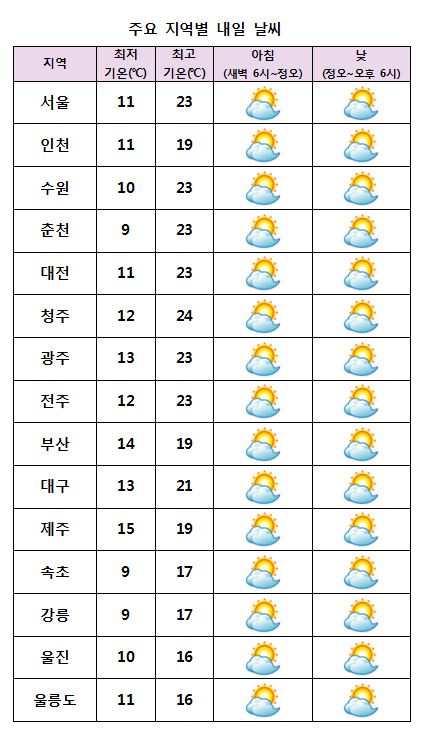 È¿äÀÏÀÎ ³»ÀÏ(30ÀÏ)Àº °æ»ó µ¿Çؾȿ¡ »õº®±îÁö ºñ°¡ ³»¸®´Ù °³°Ú°í, ±× ¹ÛÀÇ Àü±¹Àº Á¾ÀÏ ±¸¸§ÀÌ ¸¹Àº ³¯¾¾¸¦ º¸À̰ڴÙ. ¹Î°£±â»ó±â¾÷ ÄÉÀÌ¿þ´õ´Â "³»ÀÏ(30ÀÏ) ¿ì¸®³ª¶ó´Â Á¦ÁÖµµ ³²ÂÊÇØ»ó¿¡¼ µ¿ÁøÇÏ´Â ±â¾Ð°ñÀÇ ¿µÇâ¿¡¼ ¹þ¾î³ª Áß±¹ ºÏºÎÁö¹æ¿¡¼ ³²µ¿ÁøÇÏ´Â °í±â¾ÐÀÇ °¡ÀåÀÚ¸®¿¡ µé°Ú´Ù. Àü±¹¿¡ ±¸¸§ÀÌ ¸¹°ÚÀ¸³ª °æ»ó µ¿ÇؾÈÀº ´ëü·Î È帮°í »õº®±îÁö ºñ°¡ ¿À´Ù°¡ ±×Ä¡°Ú´Ù"°í ¿¹º¸Çß´Ù. ¾ÆÄ§ ÃÖÀú±â¿ÂÀº 9¡É¿¡¼ 15¡É, ³· ÃÖ°í±â¿ÂÀº 16¡É¿¡¼ 24¡É°¡ µÇ°Ú´Ù. Àü±¹ ´ëºÎºÐ Áö¿ª¿¡ Æò³âº¸´Ù ³ô°ÚÀ¸³ª µ¿ÇؾÈÁö¿ªÀº Æò³âº¸´Ù ³·°Ú´Ù. * ¿¹»ó °¼ö·®(29~30ÀÏ) - ³²ºÎ(°æºÏºÏºÎ Á¦¿Ü) : 20~50mm - ÃæÃ», °æºÏºÏºÎ, Á¦ÁÖµµ : 5~10mm - °æ±â³²ºÎ, °¿ø¿µ¼³²ºÎ : 5mm³»¿Ü