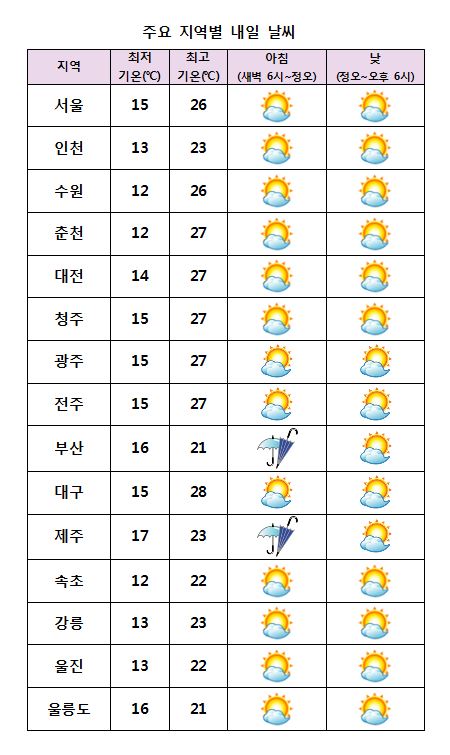 È¿äÀÏÀÎ ³»ÀÏ(14ÀÏ)Àº Á¦ÁÖµµ¿Í °æ³²³²Çؾȿ¡ ¿ÀÀü ÇѶ§ ºñ°¡ ¿À´Â °÷ÀÌ ÀÖ°Ú°í ±× ¹ÛÀÇ Áö¿ªÀº ´ëü·Î ¸¼°Ú´Ù. ¹Î°£±â»ó±â¾÷ ÄÉÀÌ¿þ´õ´Â ¡°³»ÀÏ ¿ì¸®³ª¶ó´Â µ¿ÇØ»ó¿¡ À§Ä¡ÇÑ °í±â¾ÐÀÇ ¿µÇâÀ» ¹Þ°ÚÀ¸³ª, Á¦ÁÖµµ¿Í °æ³²³²ÇؾÈÀº Á¦ÁÖµµ³²ÂÊÀ» Áö³ª´Â Àú±â¾ÐÀÇ ¿µÇâÀ» ¹Þ´Ù°¡ ¹þ¾î³ª°Ú´Ù¡±¸ç ¡°°æ³²³²ÇؾÈÀº »õº®ºÎÅÍ ¾ÆÄ§ »çÀÌ ºñ°¡ ¿À´Â °÷ÀÌ ÀÖ°Ú´Ù¡±°í ¿¹º¸Çß´Ù. ÀÌ¾î ¡°´ë±â°¡ ºÒ¾ÈÁ¤ÇØ °æ»ó³»·úÀº ¿ÀÈÄ¿¡ ¼Ò³ª±â°¡ ¿À´Â °÷ÀÌ ÀÕ°Ú°í, ÁߺÎÁö¹æÀº ´ëü·Î ¸¼°ÚÀ¸³ª, ³²ºÎÁö¹æÀº °¡²û ±¸¸§ÀÌ ¸¹°Ú´Ù¡±°í ÀüÇß´Ù. * ¿¹»ó °¼ö·®(14ÀÏ) - °æ»ó³»·ú, °æ³²³²ÇؾÈ, Á¦ÁÖµµ : 5mm³»¿Ü ¾ÆÄ§ ÃÖÀú±â¿ÂÀº 12¡É¿¡¼ 17¡É, ³· ÃÖ°í±â¿ÂÀº 21¡É¿¡¼ 28¡É°¡ µÇ°Ú´Ù.