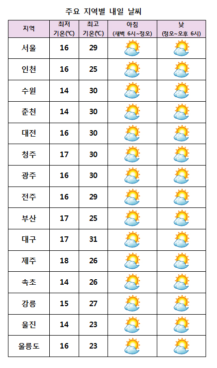 ¸ñ¿äÀÏÀÎ ³»ÀÏ(16ÀÏ)Àº Àü±¹¿¡ °¡²û ±¸¸§ÀÌ ¸¹Àº °¡¿îµ¥ Çѳ· ±â¿ÂÀÌ ¿À´Ãº¸´Ù 1~2¡É °¡·® ´õ ¿À¸£¸ç ´þ°Ú´Ù. ¹Î°£±â»ó±â¾÷ ÄÉÀÌ¿þ´õ´Â ¡°³»ÀÏ ¿ì¸®³ª¶ó´Â µ¿ÇØ»ó¿¡ À§Ä¡ÇÑ °í±â¾ÐÀÇ ¿µÇâÀ» ¹Þ°Ú´Ù¡±¸ç ¡°Àü±¹ÀÌ °¡²û ±¸¸§ÀÌ ¸¹°Ú´Ù¡±°í ¿¹º¸Çß´Ù. ¾ÆÄ§ ÃÖÀú±â¿ÂÀº 12¡É¿¡¼ 17¡É, ³· ÃÖ°í±â¿ÂÀº 23¡É¿¡¼ 30¡É°¡ µÇ°Ú´Ù. ´çºÐ°£ ±â¿ÂÀº Æò³âº¸´Ù ³ô°ÚÀ¸³ª, ³·°ú ¹ãÀÇ ±â¿ÂÂ÷°¡ 10~20µµ·Î ¸Å¿ì Ŭ °ÍÀ¸·Î ¿¹»óµÅ °Ç°°ü¸®¿¡ ÁÖÀǰ¡ ¿ä±¸µÈ´Ù.