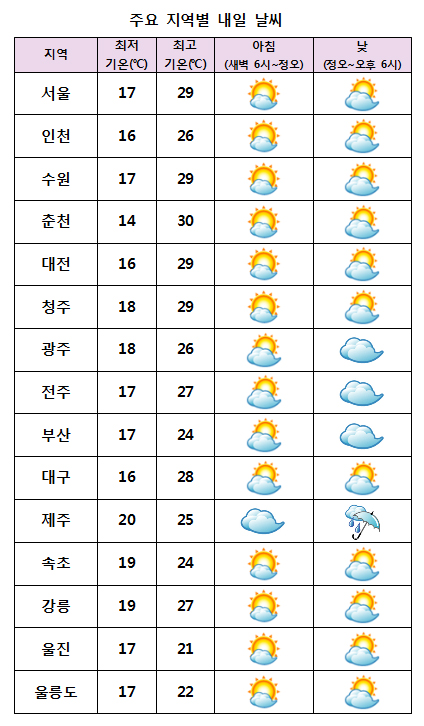 ±Ý¿äÀÏÀÎ ³»ÀÏ(17ÀÏ)Àº ÁߺÎÁö¹æÀº ´ëü·Î ¸¼Àº °¡¿îµ¥ Á¦ÁÖµµ¿¡ ³·ºÎÅÍ ºñ°¡ ³»¸®°Ú°í, Áß¼ºÎ¿Í °¿ø¿µ¼ÀÇ Ãʹ̼¼¸ÕÁö ³óµµ°¡ ¡®³ª»Ý¡¯ ¼öÁØÀÌ µÇ°Ú´Ù. ¹Î°£±â»ó±â¾÷ ÄÉÀÌ¿þ´õ´Â ¡°³»ÀÏ ¿ì¸®³ª¶ó´Â µ¿ÇØ»ó¿¡ À§Ä¡ÇÑ °í±â¾ÐÀÇ °¡ÀåÀÚ¸®¿¡ µé°ÚÀ¸³ª, ³²ºÎÁö¹æ°ú Á¦ÁÖµµ´Â ¼ÂÊ¿¡¼ ´Ù°¡¿À´Â ±â¾Ð°ñÀÇ ¿µÇâÀ» Á¡Â÷ ¹Þ°Ú´Ù¡±¸ç ¡°ÁߺÎÁö¹æÀº ´ëü·Î ¸¼´Ù°¡ ¿ÀÈĺÎÅÍ ±¸¸§ÀÌ ¸¹¾ÆÁö°Ú°í, ³²ºÎÁö¹æÀº ³·ºÎÅÍ Á¡Â÷ Èå·ÁÁ® Á¦ÁÖµµ´Â ³·¿¡, Àü³²ÇؾÈÀº ¹ã¿¡ ºñ°¡ ¿À´Â °÷ÀÌ ÀÖ°Ú½À´Ï´Ù. * ¿¹»ó °¼ö·®(17~18ÀÏ) - Á¦ÁÖµµ : 60~100mm(¸¹Àº °÷ Á¦Áֻ갣 200mm ÀÌ»ó) - Àü³² : 30~60mm - (18ÀÏ)ÀüºÏ, °æºÏ³²ºÎ, °æ³² : 5~30mm ¾ÆÄ§ ÃÖÀú±â¿ÂÀº 14¡É¿¡¼ 20¡É, ³· ÃÖ°í±â¿ÂÀº 21¡É¿¡¼ 30¡É°¡ µÇ°Ú´Ù.