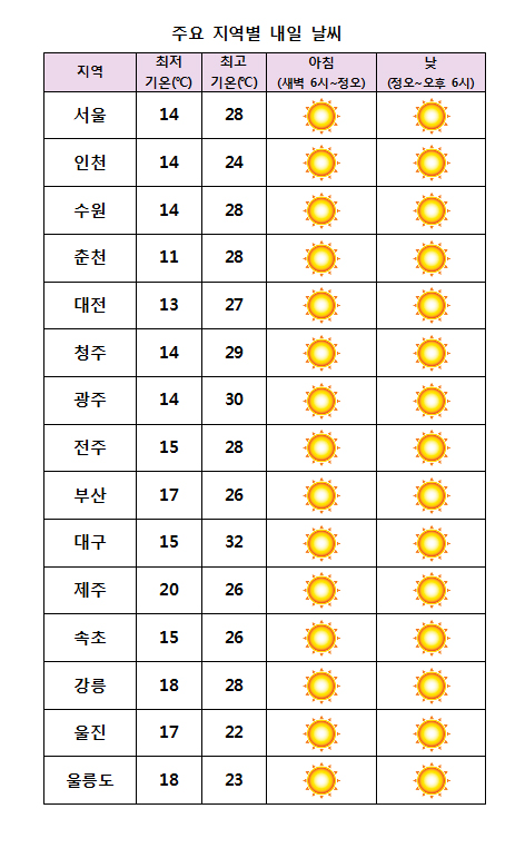 ¸ñ¿äÀÏÀÎ ³»ÀÏ(23ÀÏ)Àº Àü±¹ÀÌ ´ëü·Î ¸¼°ÚÀ¸³ª ¹Ì¼¼¸ÕÁö ³óµµ°¡ '³ª»Ý' ´Ü°è¸¦ ³ªÅ¸³¾ Àü¸ÁÀÌ´Ù. ¹Î°£±â»ó±â¾÷ ÄÉÀÌ¿þ´õ´Â ¡°³»ÀÏ ¿ì¸®³ª¶ó´Â ³²ÇØ»ó¿¡ À§Ä¡ÇÑ °í±â¾ÐÀÇ ¿µÇâÀ» ¹Þ¾Æ Àü±¹ÀÌ ¸¹°Ú´Ù¡±°í ¿¹º¸Çß´Ù. ¾ÆÄ§ ÃÖÀú±â¿ÂÀº 11¡É¿¡¼ 20¡É, ³· ÃÖ°í±â¿ÂÀº 22¡É¿¡¼ 32¡É°¡ µÇ°Ú´Ù. ´çºÐ°£ ³»·úÁö¿ªÀ» Áß½ÉÀ¸·Î ³·°ú ¹ãÀÇ ±â¿ÂÂ÷°¡ Å©°Ú°í, ¸¼Àº ³¯¾¾¿¡ Àϻ簡 ´õÇØÁö¸é¼ Çѳ· ±â¿ÂÀº Æò³â´ëºñ Å©°Ô ¿À¸£°Ú´Ù. ƯÈ÷ ³»ÀÏ(23ÀÏ) ÀϺΠ°æ»ó³»·úÁö¿ªÀÇ ³· ±â¿ÂÀÌ 32¡É±îÁö ¿À¸£¸é¼ Æø¿°Æ¯º¸°¡ ¹ßÇ¥µÉ °¡´É¼ºµµ ÀÖ°Ú´Ù.  ±¹³»¡¤¿Ü¿¡¼ ¹ß»ýÇϰí À¯ÀԵǴ ´ë±â¿À¿°¹°ÁúÀÇ ¿µÇâÀ» ¹Þ°Ú´Ù. ¹Ì¼¼¸ÕÁö ³óµµ´Â ¿ÀÀü¿¡ ¼ÂÊÁö¹æ ¡®³ª»Ý¡¯ ´Ü°è, µ¿ÂÊÁö¹æ ¡®º¸Å롯 ´Ü°è°¡ µÇ°Ú°í, ¿ÀÈÄ¿¡´Â Àü±¹ ¡®º¸Å롯 ´Ü°è¸¦ º¸À̰ڴÙ. Ãʹ̼¼¸ÕÁö ³óµµ´Â Àü±¹(°¿ø¿µµ¿ Á¦¿Ü) ¡®³ª»Ý¡¯ ´Ü°è, °¿ø¿µµ¿ ¡®º¸Å롯 ´Ü°è°¡ ¿¹»óµÈ´Ù.