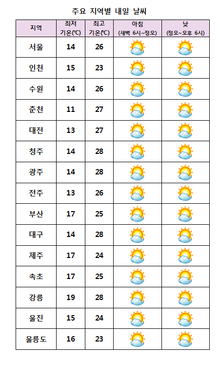 ¼ö¿äÀÏÀÎ ³»ÀÏ(29ÀÏ)Àº Àü±¹ÀÌ ´ëü·Î ¸¼Àº °¡¿îµ¥ ³·ºÎÅÍ ±â¿ÂÀÌ Â÷Ãû ¿À¸£¸ç Àϱ³Â÷°¡ Å©°Ô ¹ú¾îÁö°Ú´Ù. ¹Î°£±â»ó±â¾÷ ÄÉÀÌ¿þ´õ´Â ¡°³»ÀÏ ¿ì¸®³ª¶ó´Â Áß±¹ »óÇØ ºÎ±Ù¿¡¼ µ¿ÁøÇÏ´Â °í±â¾ÐÀÇ ¿µÇâÀ» ¹Þ¾Æ Àü±¹ÀÌ ´ëü·Î ¸¼°Ú´Ù¡±°í ¿¹º¸Çß´Ù. ¾ÆÄ§ ÃÖÀú±â¿ÂÀº 11¡É¿¡¼ 19¡É, ³· ÃÖ°í±â¿ÂÀº 23¡É¿¡¼ 28¡É°¡ µÇ°Ú´Ù. ºÏ¼ÂÊ¿¡¼ Âù °ø±â°¡ ³²ÇÏÇØ ³»ÀÏ(29ÀÏ) ¾ÆÄ§ ±â¿ÂÀº Æò³âº¸´Ù ³·°ÚÀ¸³ª, ³· ±â¿ÂÀº Àϻ翡 ÀÇÇØ Æò³âº¸´Ù ³ô°Ô ³ªÅ¸³ª°Ú´Ù.