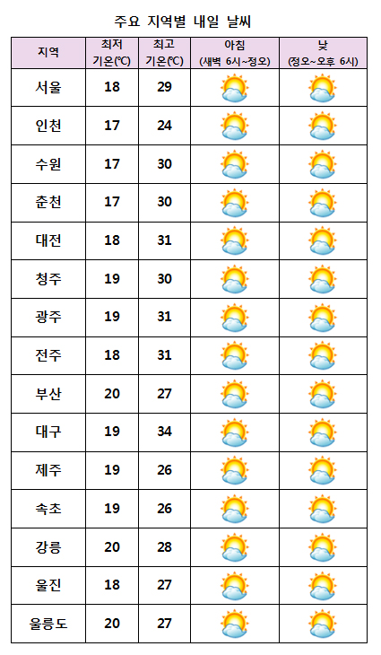 ¼ö¿äÀÏÀÎ ³»ÀÏ(5ÀÏ)Àº Àü±¹ÀÌ ´ëü·Î ¸¼Àº °¡¿îµ¥ Àڿܼ±ÀÌ °Çϰڰí, ¿µ³²Áö¹æÀÇ ¹Ì¼¼¸ÕÁö ³óµµ°¡ ¿ÀÀü ÇѶ§ ³ª»Ý ´Ü°è¸¦ º¸À̰ڴÙ. ¹Î°£±â»ó±â¾÷ ÄÉÀÌ¿þ´õ´Â ¡°³»ÀÏ ¿ì¸®³ª¶ó´Â ³²ÇØ»ó¿¡ À§Ä¡ÇÑ °í±â¾ÐÀÇ ¿µÇâÀ» ¹Þ¾Æ Àü±¹ÀÌ ´ëü·Î ¸¼°Ú´Ù¡±°í ¿¹º¸Çß´Ù. ³· ÃÖ°í±â¿ÂÀº ¼¿ï 29¡É, ºÎ»ê 27¡É, ´ë±¸ 34¡É, ±¤ÁÖ 31¡É°¡ µÇ°Ú´Ù. Æø¿°Æ¯º¸°¡ ¹ßÈ¿ ÁßÀÎ ÀϺΠ°æ»óµµ¿¡´Â ³»ÀÏ(5ÀÏ)±îÁö ³· ±â¿ÂÀÌ 33¡É ÀÌ»ó ¿À¸£´Â °÷ÀÌ ÀÖ°Ú°í, ±× ¹ÛÀÇ ³»·ú°ú µ¿Çؾȿ¡µµ 30¡É ³»¿Ü·Î ¿Ã¶ó ´þ°Ú´Ù.