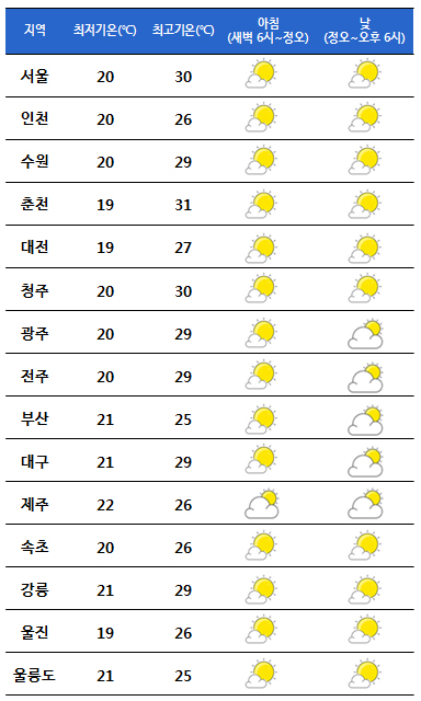 ¾ÆÄ§ ÃÖÀú±â¿ÂÀº 19¡É¿¡¼ 22¡É, ³· ÃÖ°í±â¿ÂÀº 25¡É¿¡¼ 31¡É°¡ µÇ°Ú´Ù.
