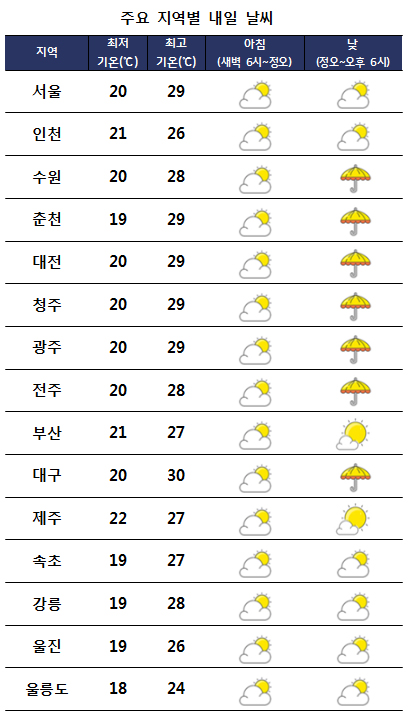 Ãʺ¹ÀÎ ³»ÀÏ(12ÀÏ¡¤±Ý)Àº Àü±¹¿¡ ±¸¸§ÀÌ ¸¹Àº °¡¿îµ¥ ³»·ú¿¡ ¿ÀÈÄ ÇѶ§ ¼Ò³ª±â°¡ ³»¸®°Ú´Ù. ¹Î°£±â»ó±â¾÷ ÄÉÀÌ¿þ´õ´Â ¡°³»ÀÏ ¿ì¸®³ª¶ó´Â ¼ÇØ»ó¿¡ À§Ä¡ÇÑ °í±â¾ÐÀÇ °¡ÀåÀÚ¸®¿¡ µé°Ú´Ù¡±¸ç ¡°°¿ø¿µµ¿°ú °æºÏºÏºÎµ¿ÇؾÈÀº È帮°í »õº®±îÁö ºñ°¡ ¿À´Ù°¡ ±×Ä¡°Ú°í, ´ë±âºÒ¾ÈÁ¤À¸·Î ÀÎÇØ ³»·ú¿¡´Â ¿ÀÈÄ ÇѶ§ ¼Ò³ª±â°¡ ¿À´Â °÷ÀÌ ÀÖ°Ú´Ù¡±°í ¿¹º¸Çß´Ù. * ¿¹»ó °¼ö·®(12ÀÏ) - ³»·ú : 5~30mm ¾ÆÄ§ ÃÖÀú±â¿ÂÀº 18¡É¿¡¼ 22¡É, ³· ÃÖ°í±â¿ÂÀº 24¡É¿¡¼ 30¡É·Î Æò³â°ú ºñ½ÁÇÑ ¼öÁØÀ» º¸À̰ڴÙ.
