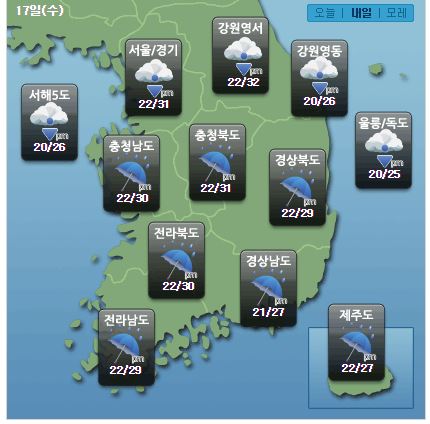 ¼ö¿äÀÏÀÎ ³»ÀÏ(17ÀÏ) ÁߺÎÁö¿ª¿¡ ¼Ò³ª±â°¡ ³»¸®°Ú°í, ³²ºÎÁö¹æÀº ¹ã¿¡ Á¦ÁÖµµ¿¡ ºñ°¡ ³»¸®°Ú´Ù. ¹Î°£±â»ó±â¾÷ ÄÉÀÌ¿þ´õ´Â ¡°³»ÀÏ ÁߺÎÁö¹æ°ú °æºÏºÏºÎ´Â µ¿ÇØ»ó¿¡ À§Ä¡ÇÑ °í±â¾ÐÀÇ °¡ÀåÀÚ¸®¿¡ µé°ÚÀ¸³ª, ³²ºÎÁö¹æÀº ºÏ»óÇÏ´Â À帶Àü¼±ÀÇ ¿µÇâÀ» Á¡Â÷ ¹Þ°Ú´Ù¡±¸ç ¡°ÁߺΠ¹× °æºÏºÏºÎ´Â ´ë±â°¡ ºÒ¾ÈÁ¤ÇØ ¼Ò³ª±â°¡ ¿À´Â °÷ÀÌ ¸¹°Ú´Ù¡±°í ¿¹º¸Çß´Ù. ÀÌ¾î ¡°³²ºÎÁö¹æÀº Á¡Â÷ Èå·ÁÁ® Àú³á¿¡ Á¦ÁÖµµ¿¡ ºñ°¡ ½ÃÀ۵Š¹ã¿¡ Àü³²°ú °æ³²Áö¿ª±îÁö È®´ëµÇ°Ú°í, ¸ð·¹(18ÀÏ) »õº®¿¡´Â Àü±¹¿¡ ºñ°¡ ³»¸®°Ú´Ù¡±°í ¿¹º¸Çß´Ù. * ¿¹»ó°¼ö·®(17~18ÀÏ) - ÁߺϺΠ: 10~40mm - ÃæÃ», ÀüºÏ, °æºÏ : 30~50mm - (19ÀϱîÁö ºñ)Á¦ÁÖ, Àü³², °æ³² : 50~80mm(¸¹Àº °÷ 120mmÀÌ»ó)