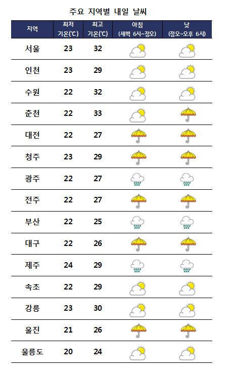 ¸ñ¿äÀÏÀÎ ³»ÀÏ(18ÀÏ)Àº ÃæÃ»À̳²Áö¹æ°ú ÁߺΠÀϺΠÁö¿ª¿¡ ÇѶ§ ºñ°¡ ³»¸± Àü¸ÁÀÌ´Ù. ¹Î°£±â»ó±â¾÷ ÄÉÀÌ¿þ´õ´Â ¡°³»ÀÏ ¿ì¸®³ª¶ó´Â À帶Àü¼±ÀÇ ¿µÇâÀ» ¹Þ°Ú´Ù¡±¸ç ¡°Àü±¹ÀÌ ´ëü·Î È帰 °¡¿îµ¥ ¼¿ï°ú °æ±â, °¿ø¿µ¼ Áö¿ªÀº »õº®ºÎÅÍ ¾ÆÄ§»çÀÌ »ê¹ßÀûÀ¸·Î ºø¹æ¿ïÀÌ ¶³¾îÁö´Â °÷ÀÌ ÀÖ°Ú°í, °æ±â µ¿ºÎ¿Í °¿ø¿µ¼´Â ´ë±âºÒ¾ÈÁ¤À¸·Î ¿ÀÈÄ¿¡ ¼Ò³ª±â°¡ ¿À´Â °÷ÀÌ ÀÖ°Ú´Ù¡±°í ¿¹º¸Çß´Ù. ÀÌ¾î ¡°ÃæÃ»À̳²Áö¹æÀº È帮°í ºñ°¡ ¿À°ÚÀ¸³ª, ÃæÃ»µµ¿Í ÀüºÏ, °æºÏÀº »õº®±îÁö ºñ°¡ ¿À´Ù°¡ ±×Ä£ ÈÄ ³· µ¿¾È ¼Ò³ª±â°¡ ¿À´Â °÷ÀÌ ÀÖ°Ú´Ù¡±°í ÀüÇß´Ù. * ¿¹»ó °¼ö·®(17~19ÀÏ) - Á¦ÁÖµµ : 100~150mm(¸¹Àº °÷ 250mmÀÌ»ó) - Àü¶óµµ, °æ³² : 50~100mm(¸¹Àº °÷ ³²ÇØ¾È 200mmÀÌ»ó) - ÃæÃ»µµ, °æºÏ(18ÀϺÎÅÍ) : 20~50mm - ¼¿ï.°æ±âµµ, °¿ø¿µ¼(°æ±âµ¿ºÎ, °¿ø¿µ¼ 18ÀϱîÁö, ¼¿ï.°æ±â¼ºÎ 17ÀÏ) : 5~30mm ¾ÆÄ§ ÃÖÀú±â¿ÂÀº 20¡É¿¡¼ 24¡É, ³· ÃÖ°í±â¿ÂÀº 24¡É¿¡¼ 33¡É·Î Æò³â°ú ºñ½ÁÇÑ ¼öÁØÀ» º¸À̰ڴÙ.