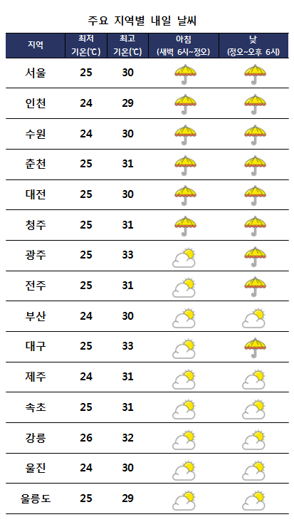 ¾ÆÄ§ ÃÖÀú±â¿ÂÀº 24¡É¿¡¼ 26¡É, ³· ÃÖ°í±â¿ÂÀº 29¡É¿¡¼ 33¡É°¡ µÇ°Ú´Ù. µ¿ÇؾȰú ÀϺΠ°æºÏ ³»·úÀº ±â¿ÂÀÌ 35¡É±îÁö ¿À¸£¸ç ¹«´þ°Ú´Ù.
