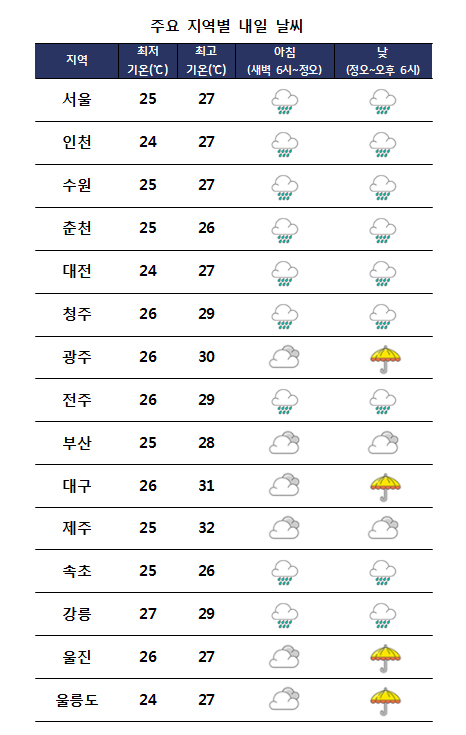 ±Ý¿äÀÏÀÎ ³»ÀÏ(25ÀÏ)Àº ÁߺÎÁö¹æ¿¡ Àå¸Àºñ°¡ ³»¸®°Ú°í ³²ºÎÁö¹æ¿¡´Â ¼Ò³ª±â°¡ ³»¸± Àü¸ÁÀÌ´Ù. ¹Î°£±â»ó±â¾÷ ÄÉÀÌ¿þ´õ´Â ¡°³»ÀÏ ¿ì¸®³ª¶ó´Â À帶Àü¼±ÀÇ ¿µÇâÀ» ¹Þ°Ú´Ù¡±¸ç ¡°Àü±¹ÀÌ È帰 °¡¿îµ¥ ÁߺÎÁö¹æ°ú ÀüºÏ, °æºÏºÏºÎ¿¡ ºñ°¡ ¿À°Ú°í, Àü³²°ú °æºÏ³²ºÎ, °æ³²(³²ÇØ¾È Á¦¿Ü)Àº ¿ÀÈÄ ÇѶ§ ´ë±âºÒ¾ÈÁ¤À¸·Î ¼Ò³ª±â°¡ ¿À´Â °÷ÀÌ ÀÖ°Ú´Ù¡±°í ¿¹º¸Çß´Ù. * ¿¹»ó °¼ö·®(~28ÀÏ) - ÁߺÎ(°¿ø¿µµ¿ Á¦¿Ü) : 100~200mm(¸¹Àº °÷ 400mmÀÌ»ó) - (27ÀϱîÁö) °¿ø¿µµ¿(26ÀϺÎÅÍ), ÀüºÏ, °æºÏºÏºÎ : 30~80mm(¸¹Àº °÷ 100mmÀÌ»ó) - (27ÀϱîÁö) Àü³², °æºÏ³²ºÎ, °æ³²(³²ÇØ¾È Á¦¿Ü) : 5~30mm ÀÌ¾î ¡°Áö¿ª¿¡ µû¶ó 400mm ÀÌ»óÀÇ ¸Å¿ì ¸¹Àº ¾çÀÇ ºñ°¡ ³»¸®°Ú°í, °÷¿¡ µû¶ó ¼Ò°»óŸ¦ º¸ÀÌ´Â °÷µµ ¸¹°Ú´Ù¡±¸ç ¡°¸ð·¹(27ÀÏ)±îÁö ³· ±â¿ÂÀÌ 30¡É ÀÌ»ó ¿À¸£´Â °÷ÀÌ ¸¹¾Æ ´þ°Ú°í, ¸ð·¹(27ÀÏ) ¾ÆÄ§±îÁö °æ»óµµ¿Í µ¿ÇؾÈÀ» Áß½ÉÀ¸·Î ¿´ë¾ß°¡ ³ªÅ¸³ª´Â °÷ÀÌ ÀÖ°Ú´Ù¡±°í ÀüÇß´Ù. ¾ÆÄ§ ÃÖÀú±â¿ÂÀº 24¡É¿¡¼ 27¡É, ³· ÃÖ°í±â¿ÂÀº 26¡É¿¡¼ 32¡É°¡ µÇ°Ú´Ù.