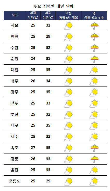 È¿äÀÏÀÎ ³»ÀÏ(30ÀÏ)Àº Àü±¹ÀÌ ´ëü·Î ¸¼Àº °¡¿îµ¥ ÁߺΠÀϺΠÁö¿ª¿¡ ¿ÀÈÄ ÇѶ§ ¼Ò³ª±â°¡ ³»¸± Àü¸ÁÀÌ´Ù. ¹Î°£±â»ó±â¾÷ ÄÉÀÌ¿þ´õ´Â ¡°³»ÀÏ ¿ì¸®³ª¶ó´Â ºÏÅÂÆò¾ç °í±â¾ÐÀÇ ¿µÇâÀ» ¹Þ¾Æ Àü±¹ÀÌ ´ëü·Î ¸¼°Ú´Ù¡±¸ç ¡°ÁßºÏºÎ¿Í ÃæÃ»ºÏºÎÁö¿ªÀº ´ë±â°¡ ºÒ¾ÈÁ¤ÇØ ¿ÀÈÄ ÇѶ§ ¼Ò³ª±â°¡ ¿À´Â °÷ÀÌ ÀÖ°Ú´Ù¡±°í ¿¹º¸Çß´Ù. * ¿¹»ó °¼ö·®(30ÀÏ) - ÁߺϺÎ, ÃæÃ»ºÏºÎ : 5~30mm ¾ÆÄ§ ÃÖÀú±â¿ÂÀº 25¡É¿¡¼ 27¡É, ³· ÃÖ°í±â¿ÂÀº 29¡É¿¡¼ 35¡É°¡ µÇ°Ú´Ù. Æø¿°Æ¯º¸°¡ ¹ßÇ¥µÈ ÃæÃ»³»·ú°ú °¿ø µ¿ÇؾÈ, ³²ºÎÁö¹æ¿¡´Â ³· ±â¿ÂÀÌ 33¡É ÀÌ»ó, ±× ¹ÛÀÇ ÁߺÎÁö¹æ¿¡µµ 31¡É ÀÌ»ó ¿À¸£´Â °÷ÀÌ ÀÖ°Ú´Ù.
