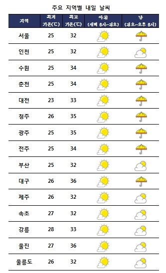 ±Ý¿äÀÏÀÎ ³»ÀÏ(2ÀÏ)Àº Àü±¹ÀÌ ´ëü·Î ¸¼°ÚÀ¸³ª ³»·ú °÷°÷¿¡ Àú³á ÇѶ§ ¼Ò³ª±â°¡ ³»¸®´Â °÷ÀÌ ÀÖ°Ú´Ù. ¹Î°£±â»ó±â¾÷ ÄÉÀÌ¿þ´õ´Â ¡°³»ÀÏ ¿ì¸®³ª¶ó´Â ºÏÅÂÆò¾ç °í±â¾ÐÀÇ ¿µÇâÀ» ¹Þ°Ú´Ù¡±¸ç ¡°Àü±¹¿¡ °¡²û ±¸¸§ÀÌ ¸¹Àº °¡¿îµ¥ ´ÊÀº ¿ÀÈÄ¿¡¼ ¹ã»çÀÌ¿¡ ´ë±â°¡ ºÒ¾ÈÁ¤ÇØ ¼Ò³ª±â°¡ ¿À´Â °÷ÀÌ ÀÖ°Ú´Ù¡±°í ¿¹º¸Çß´Ù. * ¿¹»ó °¼ö·®(2ÀÏ) - Àü±¹³»·ú : 5~40mm ¾ÆÄ§ ÃÖÀú±â¿ÂÀº 23¡É¿¡¼ 28¡É, ³· ÃÖ°í±â¿ÂÀº 31¡É¿¡¼ 36¡É°¡ µÇ°Ú´Ù. ³»Àϵµ ³»·úÀ» Áß½ÉÀ¸·Î ³· ÃÖ°í±â¿ÂÀÌ 33¡É ³»¿Ü¸¦ º¸ÀÌ¸ç ¸Å¿ì ´þ°ÚÀ¸´Ï °Ç°°ü¸®¿¡ À¯ÀÇÇØ¾ß°Ú´Ù.