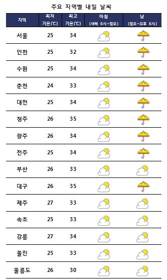 ±Ý¿äÀÏÀÎ ³»ÀÏ(9ÀÏ)Àº Àü±¹ÀÌ ±¸¸§ÀÌ ¸¹°Ú°í, ¿ÀÈÄ ÇѶ§ ³»·ú °÷°÷¿¡ ¼Ò³ª±â°¡ ³»¸®´Â °÷ÀÌ ÀÖ°Ú´Ù. ¹Î°£±â»ó±â¾÷ ÄÉÀÌ¿þ´õ´Â ¡°³»ÀÏ ¿ì¸®³ª¶ó´Â ºÏÅÂÆò¾ç °í±â¾ÐÀÇ °¡ÀåÀÚ¸®¿¡ µé°Ú´Ù¡±¸ç ¡°Àü±¹ÀÌ ´ëü·Î ±¸¸§ÀÌ ¸¹°Ú°í, ´ë±âºÒ¾ÈÁ¤À¸·Î ³»·úÀ» Áß½ÉÀ¸·Î ¿ÀÈÄ¿¡ ¼Ò³ª±â°¡ ¿À´Â °÷ÀÌ ÀÖ°Ú´Ù¡±°í ¿¹º¸Çß´Ù. * ¿¹»ó °¼ö·®(8ÀÏ) - Àü±¹ ³»·ú : 5~30mm ¾ÆÄ§ ÃÖÀú±â¿ÂÀº 24¡É¿¡¼ 27¡É, ³· ÃÖ°í±â¿ÂÀº 30¡É¿¡¼ 35¡É°¡ µÇ°Ú´Ù. ¿À´Ãº¸´Ù ±â¿ÂÀÌ ´õ ¿À¸£¸é¼ Æø¿°Æ¯º¸°¡ Àü±¹ÀûÀ¸·Î È®´ë¡¤°ÈµÉ °¡´É¼ºÀÌ ÀÖ°Ú´Ù.