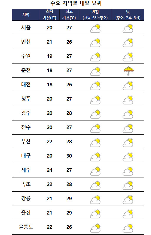 ±Ý¿äÀÏÀÎ ³»ÀÏ(30ÀÏ)Àº Àü±¹ÀÌ ´ëü·Î ¸¼°ÚÀ¸³ª °æ±âºÏºÎ¿Í °¿ø¿µ¼ ºÏºÎ¿¡ ¿ÀÈÄ ÇѶ§ ¼Ò³ª±â°¡ ³»¸± Àü¸ÁÀÌ´Ù. ¹Î°£±â»ó±â¾÷ ÄÉÀÌ¿þ´õ´Â ¡°³»ÀÏ ¿ì¸®³ª¶ó´Â Áß±¹ ºÏºÎÁö¹æ¿¡ À§Ä¡ÇÑ °í±â¾ÐÀÇ °¡ÀåÀÚ¸®¿¡ µé°Ú´Ù¡±¸ç ¡°Àü±¹ÀÌ ´ëü·Î ±¸¸§ÀÌ ¸¹Àº °¡¿îµ¥ °æ±âºÏºÎ¿Í °¿ø¿µ¼ºÏºÎ´Â ´ë±â°¡ ºÒ¾ÈÁ¤ÇØ ¿ÀÈÄ ÇѶ§ ¼Ò³ª±â°¡ ¿À°Ú´Ù¡±°í ¿¹º¸Çß´Ù. ¾ÆÄ§ ÃÖÀú±â¿ÂÀº 18¡É¿¡¼ 24¡É, ³· ÃÖ°í±â¿ÂÀº 26¡É¿¡¼ 30¡É·Î Æò³â ¼öÁØÀ» º¸À̰ڴÙ.