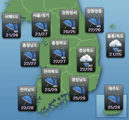 ±Ý¿äÀÏÀÎ ³»ÀÏ(ÀÏ)Àº Àü±¹ÀÌ ´ëü·Î È帰 °¡¿îµ¥ °÷°÷¿¡ ºñ°¡ ³»¸± Àü¸ÁÀÌ´Ù. ¹Î°£±â»ó±â¾÷ ÄÉÀÌ¿þ´õ´Â ¡°³»ÀÏ(6ÀÏ) ¿ì¸®³ª¶ó´Â Á¤Ã¼Àü¼±ÀÇ ¿µÇâÀ» ¹Þ´Ù°¡ ¹þ¾î³ª°ÚÀ¸³ª, ³²ºÎÁö¹æÀº ºÏ»óÇÏ´Â Á¦13È£ ÅÂdz ¡®¸µ¸µ(LINGLING)¡¯ÀÇ ¿µÇâÀ» Á¡Â÷ ¹Þ°Ú´Ù¡±°í ¿¹º¸Çß´Ù. * ¿¹»ó °¼ö·®(5~6ÀÏ) - ¼¿ï. °æ±â, ÃæÃ», ÀüºÏ, Á¦ÁÖµµ : 50~100mm(¸¹Àº °÷ 150mmÀÌ»ó) - °¿ø, Àü³², °æ»óµµ : 20~60mm(¸¹Àº °÷ 100mmÀÌ»ó) ÀÌ¾î ¡°Àü±¹ÀÌ È帮°í ÁߺÎÁö¹æÀº ¿ÀÀü±îÁö ºñ°¡ ¿À´Ù°¡ ±×Ä¡°ÚÀ¸³ª, Àü¶óºÏµµ¿Í °æ»óµµ(³²ÇØ¾È Á¦¿Ü)´Â ¿ÀÈÄ ÇѶ§ ¼Ò³ª±â°¡ ¿À´Â °÷ÀÌ ÀÖ°Ú´Ù. µ¿Ç³ÀÇ ¿µÇâÀ¸·Î °æ³²ÇؾȰú Á¦ÁÖµµ´Â ¾ÆÄ§ºÎÅÍ ºñ°¡ ½ÃÀ۵Š¹ã¿¡´Â Àü¶ó³²µµ±îÁö È®´ëµÇ°Ú´Ù. ±× ¹ÛÀÇ ³²ºÎÁö¹æ¿¡´Â ¿ÀÈÄ ÇѶ§ ¼Ò³ª±â°¡ ¿À´Â °÷ÀÌ ÀÖ°Ú´Ù¡±°í ÀüÇß´Ù. ¾ÆÄ§ ÃÖÀú±â¿ÂÀº 20¡É¿¡¼ 25¡É, ³· ÃÖ°í±â¿ÂÀº 26¡É¿¡¼ 29¡É°¡ µÇ°Ú´Ù.