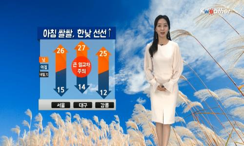 È¿äÀÏÀÎ ³»ÀÏ(24ÀÏ¡¤È)Àº ÄèûÇÑ °¡¿îµ¥ Àϱ³Â÷°¡ Å©°Ô ¹ú¾îÁö°Ú´Ù. ¹Î°£±â»ó±â¾÷ ÄÉÀÌ¿þ´õ¿¡ µû¸£¸é ³»ÀÏ(24ÀÏ¡¤È)Àº Áß±¹ ºÏºÎÁö¹æ¿¡¼ µ¿ÁøÇÏ´Â °í±â¾ÐÀÇ ¿µÇâÀ» ¹Þ¾Æ Àü±¹ÀÌ ´ëü·Î ¸¼°Ú´Ù. ¾ÆÄ§ ÃÖÀú±â¿ÂÀº ºÏ¼ÂÊ¿¡¼ Âù °ø±â°¡ ¹Ð·Á¿À¸é¼ 10~18¡É·Î ¿À´Ãº¸´Ù 2~5¡É°¡·® ³·¾Æ ½Ò½ÒÇϰڰí, ³· ÃÖ°í±â¿ÂÀº 24~27¡É±îÁö ¿Ã¶ó ¼±¼±Çϰųª ´Ù¼Ò ´þ°Ú´Ù. ¹Ì¼¼¸ÕÁö ³óµµ´Â 'ÁÁÀ½' ´Ü°è·Î °ø±â ÁúÀº ±ú²ýÇϰڴÙ. ´Ù¸¸, °ÇÑ ÇÞºµ¿¡ Àڿܼ± Áö¼ö°¡ ³ô°Ô ¿Ã¶ó ¹Ù±ù Ȱµ¿ ½Ã ÁÖÀǰ¡ ÇÊ¿äÇϰڴÙ. µ¿ÇظչٴٷΠdz¶ûƯº¸°¡ À̾îÁö´Â °¡¿îµ¥ ¹°°áÀÌ ÃÖ°í 4m±îÁö ¸Å¿ì ³ô°Ô Àϰڰí, ³²ÇØ»óµµ ÃÖ°í 3m±îÁö ³ô°Ô ÀϰڴÙ. ´çºÐ°£ Àϱ³Â÷°¡ Å« ³¯µéÀÌ À̾îÁö°Ú°í, À̹ø ÁÖ ±¸¸§ ¸¹°ÚÁö¸¸ ±Ý¿äÀÏ(27ÀÏ)°ú Åä¿äÀÏ(28ÀÏ) »çÀÌ ³²ºÎ¿Í Á¦ÁÖµµ¿¡ ºñ ¼Ò½ÄÀÌ ÀÖÀ» Àü¸ÁÀÌ´Ù.