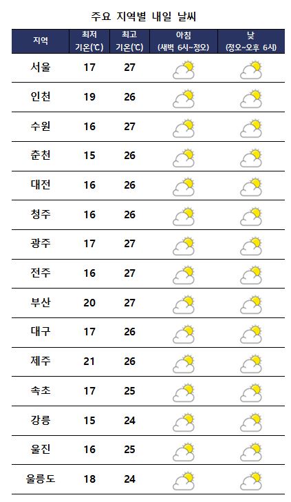 ¸ñ¿äÀÏÀÎ ³»ÀÏ(26ÀÏ)Àº Àü±¹¿¡ ±¸¸§ÀÌ ¸¹°Ú°í, Á¦ÁÖµµ´Â Èå·ÁÁ® ¹ãºÎÅÍ ºñ°¡ ¿À´Â °÷ÀÌ ÀÖ°Ú´Ù. ¹Î°£±â»ó±â¾÷ ÄÉÀÌ¿þ´õ´Â ¡°³»ÀÏ ¿ì¸®³ª¶ó´Â µ¿ÇØ»ó¿¡ À§Ä¡ÇÑ °í±â¾ÐÀÇ °¡ÀåÀÚ¸®¿¡ µé°Ú´Ù¡±¸ç ¡°Àü±¹¿¡ ±¸¸§ÀÌ ¸¹Àº °¡¿îµ¥ Á¦ÁÖµµ´Â ³· µ¿¾È »ê¹ßÀûÀ¸·Î ºø¹æ¿ïÀÌ ¶³¾îÁö´Â °÷ÀÌ ÀÖ°Ú°í, Á¡Â÷ Èå·ÁÁ® ¹ãºÎÅÍ °÷°÷¿¡ ºñ°¡ ¿À°Ú´Ù¡±°í ¿¹º¸Çß´Ù. * ¿¹»ó °¼ö·®(26ÀÏ) - Á¦ÁÖµµ : 5~10mm ¾ÆÄ§ ÃÖÀú±â¿ÂÀº 15¡É¿¡¼ 21¡É, ³· ÃÖ°í±â¿ÂÀº 24¡É¿¡¼ 27¡É°¡ µÇ°Ú´Ù. ³»ÀÏ(26ÀÏ)±îÁö ¹ã»çÀÌ ÁöÇ¥¸é ³Ã°¢À¸·Î ±â¿ÂÀÌ ¶³¾îÁö°í, ³· µ¿¾È¿¡´Â ÀÏ»ç·Î ÀÎÇØ ±â¿ÂÀÌ ¿Ã¶ó ³»·úÀ» Áß½ÉÀ¸·Î ³·°ú ¹ãÀÇ ±â¿ÂÂ÷°¡ 10¡É ÀÌ»óÀ¸·Î Å©°Ô ¹ú¾îÁö°Ú´Ù.