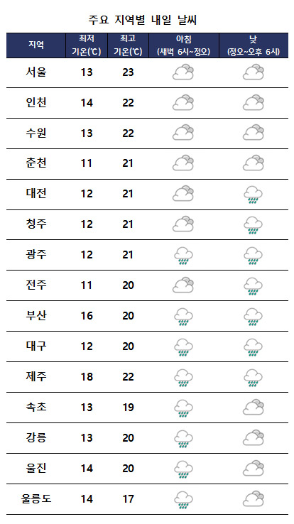 ±Ý¿äÀÏÀÎ ³»ÀÏ(18ÀÏ) Àü±¹¿¡ ±¸¸§ÀÌ ¸¹Àº °¡¿îµ¥ ÃæÃ»À̳²Áö¹æ¿¡ ºñ°¡ ¿Ã Àü¸ÁÀÌ´Ù. ¹Î°£±â»ó±â¾÷ ÄÉÀÌ¿þ´õ´Â ¡°³»ÀÏ ¿ì¸®³ª¶ó´Â ³²ÇØ»óÀ» Áö³ª´Â ±â¾Ð°ñÀÇ ¿µÇâÀ» ¹Þ°Ú´Ù¡±¸ç ¡°Àü±¹ÀÌ Á¡Â÷ Èå·ÁÁ® Á¦ÁÖµµ´Â »õº®ºÎÅÍ, °¿ø¿µµ¿°ú °æ»óÇØ¾ÈÀº ¾ÆÄ§ºÎÅÍ ºñ°¡ ¿À°Ú´Ù¡±°í ¿¹º¸Çß´Ù. ÀÌ¾î ¡°ÃæÃ», Àü¶ó, °æ»ó³»·úÀº ³·ºÎÅÍ ¹ã±îÁö ºñ°¡ ³»¸®°ÚÀ¸¸ç °¿ø¿µµ¿°ú °æ»óÇØ¾È, Á¦ÁÖµµ´Â 19ÀϱîÁö À̾îÁö°Ú´Ù¡±¸ç ¡°³»ÀÏ(18ÀÏ) ¹ãºÎÅÍ ¸ð·¹(19ÀÏ) »õº® »çÀÌ ¼¿ï°ú °æ±â, °¿ø¿µ¼Áö¹æ¿¡ »ê¹ßÀûÀ¸·Î ºø¹æ¿ïÀÌ ¶³¾îÁö´Â °÷ÀÌ ÀÖ°Ú´Ù¡±°í ÀüÇß´Ù. * ¿¹»ó °¼ö·®(~19ÀÏ) - °¿ø¿µµ¿, °æ»óÇØ¾È, Á¦ÁÖµµ(~19ÀÏ) : 10~40mm - Àü³², °æ³²³»·ú : 5~10mm - ÃæÃ», ÀüºÏ, °æºÏ³»·ú : 5mm³»¿Ü ¾ÆÄ§ ÃÖÀú±â¿ÂÀº 11¡É¿¡¼ 18¡É, ³· ÃÖ°í±â¿ÂÀº 17¡É¿¡¼ 23¡É°¡ µÇ°Ú´Ù.