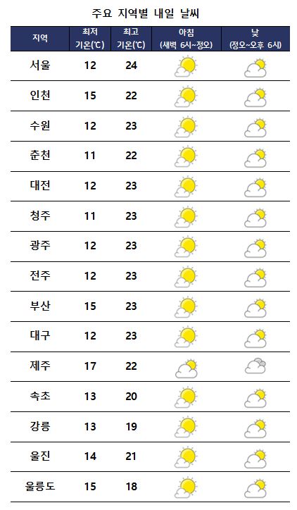È¿äÀÏÀÎ ³»ÀÏ(22ÀÏ)Àº Àü±¹ÀÌ ´ëü·Î ¸¼Àº ³¯¾¾¸¦ º¸À̰ÚÀ¸³ª ¼ÂÊ ÀϺΠÁö¹æ¿¡¼´Â ¿ÀÀü±îÁö ¹Ì¼¼¸ÕÁö ³óµµ°¡ ³ô°Ô ³ªÅ¸³ª°Ú´Ù. ¹Î°£±â»ó±â¾÷ ÄÉÀÌ¿þ´õ´Â ¡°³»ÀÏ ¿ì¸®³ª¶ó´Â Áß±¹ ÁߺÎÁö¹æ¿¡ À§Ä¡ÇÑ °í±â¾ÐÀÇ ¿µÇâÀ» ¹Þ°Ú´Ù¡±¸ç ¡°Àü±¹¿¡ ±¸¸§ÀÌ ¸¹¾ÆÁö°Ú°í, Á¦ÁÖµµ´Â Á¡Â÷ Èå·ÁÁö°Ú´Ù¡±°í ¿¹º¸Çß´Ù. ¾ÆÄ§ ÃÖÀú±â¿ÂÀº 11¡É¿¡¼ 17¡É, ³· ÃÖ°í±â¿ÂÀº 18¡É¿¡¼ 24¡É°¡ µÇ°Ú´Ù. ´çºÐ°£ ±â¿ÂÀº Æò³âº¸´Ù ³ô°Ú°í ³·°ú ¹ãÀÇ ±â¿ÂÂ÷°¡ Å©°Ú´Ù.