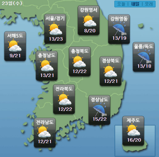 ¼ö¿äÀÏÀÎ ³»ÀÏ(23ÀÏ)Àº Àü±¹ÀÌ Á¡Â÷ Èå·ÁÁö°Ú°í, µ¿ÇؾȰú °æ³²Çؾȿ¡ Àú³áºÎÅÍ ºñ°¡ ¿À°Ú´Ù. ¹Î°£±â»ó±â¾÷ ÄÉÀÌ¿þ´õ´Â ¡°³»ÀÏ ¿ì¸®³ª¶ó´Â Áß±¹ ºÏµ¿ Áö¹æ¿¡ À§Ä¡ÇÑ °í±â¾ÐÀÇ ¿µÇâÀ» ¹Þ°Ú´Ù¡±¸ç ¡°Àü±¹ÀÌ Á¡Â÷ Èå·ÁÁö°Ú°í, µ¿ÇؾȰú °æ³²ÇؾÈÀº Àú³áºÎÅÍ ºñ°¡ ¿À°Ú´Ù¡±°í ¿¹º¸Çß´Ù. ÀÌ¾î ¡°Áß¼ºÎÁö¹æÀº ³»ÀÏ(23ÀÏ) ¹ãºÎÅÍ ¸ð·¹(24ÀÏ) ¾ÆÄ§ »çÀÌ¿¡ »ê¹ßÀûÀ¸·Î ºø¹æ¿ïÀÌ ¶³¾îÁö´Â °÷ÀÌ ÀÖ°Ú´Ù¡±°í ÀüÇß´Ù. ¾ÆÄ§ ÃÖÀú±â¿ÂÀº 8¡É¿¡¼ 16¡É, ³· ÃÖ°í±â¿ÂÀº 18¡É¿¡¼ 22¡É°¡ µÇ°Ú´Ù.