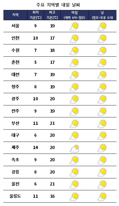 È¿äÀÏÀÎ ³»ÀÏ(5ÀÏ)Àº Àü±¹ÀÌ ´ëü·Î ¸¼Àº °¡¿îµ¥ Çѳ·¿¡ ±â¿ÂÀº Æò³â°ú ºñ½ÁÇϰųª ±×º¸´Ù ³ô°Ô ³ªÅ¸³ª°Ú´Ù. ¹Î°£±â»ó±â¾÷ ÄÉÀÌ¿þ´õ´Â ¡°³»ÀÏ(5ÀÏ) ¿ì¸®³ª¶ó´Â Áß±¹ ºÏºÎÁö¹æ¿¡¼ ³²µ¿ÁøÇÏ´Â °í±â¾ÐÀÇ ¿µÇâÀ» ¹Þ°Ú´Ù¡±¸ç ¡°Àü±¹ÀÌ ´ëü·Î ¸¼Àº °¡¿îµ¥ Á¦ÁÖµµ´Â È帰 ÈÄ °³°Ú°í »õº®±îÁö ºø¹æ¿ïÀÌ ¶³¾îÁú °¡´É¼ºµµ ÀÖ°Ú´Ù¡±°í ¿¹º¸Çß´Ù. ¾ÆÄ§ ÃÖÀú±â¿ÂÀº 5¡É¿¡¼ 14¡É, ³· ÃÖ°í±â¿ÂÀº 16¡É¿¡¼ 21¡É°¡ µÇ°Ú´Ù. ¹ã»çÀÌ º¹»ç³Ã°¢À¸·Î ±â¿ÂÀÌ ¶³¾îÁö°í, ³· µ¿¾È¿¡´Â ÀÏ»ç·Î ÀÎÇØ ±â¿ÂÀÌ ¿À¸£¸é¼ ³»·úÀ» Áß½ÉÀ¸·Î ³·°ú ¹ãÀÇ ±â¿Â Â÷°¡ 10¡É ÀÌ»ó Å©°Ú´Ù.