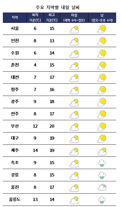 ¸ñ¿äÀÏÀÎ ³»ÀÏ(7ÀÏ)Àº Àü±¹ ´ëºÎºÐ Áö¿ªÀÌ ¸¼°ÚÀ¸³ª ¿µµ¿¡¤µ¿ÇؾÈÁö¿ªÀº ¿ÀÈĺÎÅÍ ºñ°¡ ³»¸± Àü¸ÁÀÌ´Ù. ¹Î°£±â»ó±â¾÷ ÄÉÀÌ¿þ´õ´Â ¡°³»ÀÏ ¿ì¸®³ª¶ó´Â Áß±¹ ºÏºÎÁö¹æ¿¡¼ ³²µ¿ÁøÇÏ´Â °í±â¾ÐÀÇ °¡ÀåÀÚ¸®¿¡ µé°Ú´Ù¡±¸ç ¡°Àü±¹¿¡ ±¸¸§ÀÌ ¸¹´Ù°¡ Á¡Â÷ ¸¼¾ÆÁö°Ú°í, µ¿Ç³ÀÇ ¿µÇâÀ¸·Î °¿ø¿µµ¿Àº ¿ÀÈĺÎÅÍ, °æºÏ µ¿ÇؾÈÀº Àú³áºÎÅÍ ºñ°¡ ³»¸®°Ú´Ù¡±°í ¿¹º¸Çß´Ù. * ¿¹»ó °¼ö·®(~8ÀÏ) - °¿ø¿µµ¿, °æºÏ µ¿ÇØ¾È : 5~20mm ¾ÆÄ§ ÃÖÀú±â¿ÂÀº 4¡É¿¡¼ 12¡É, ³· ÃÖ°í±â¿ÂÀº 13¡É¿¡¼ 20¡É°¡ µÇ°Ú´Ù. ¸ð·¹(8ÀÏ)±îÁö ¹ã»çÀÌ¿¡ º¹»ç³Ã°¢À¸·Î ±â¿ÂÀÌ ¶³¾îÁö°í, ³· µ¿¾È¿¡´Â ÀÏ»ç·Î ÀÎÇØ ±â¿ÂÀÌ ¿À¸£¸é¼ ±â¿ÂÂ÷°¡ 10¡É ÀÌ»ó Å©°Ú´Ù. ¶ÇÇÑ ¸ð·¹(8ÀÏ)´Â ¾ÆÄ§ ±â¿ÂÀÌ Å« ÆøÀ¸·Î ¶³¾îÁö¸é¼ Áߺγ»·ú°ú ÀϺΠ³²ºÎ³»·ú¿¡ ¿µÇÏÀÇ ±â¿ÂºÐÆ÷¸¦ º¸ÀÌ´Â °÷ÀÌ ÀÖ°Ú´Ù. ³»·úÀ» Áß½ÉÀ¸·Î £Àº ¾È°³°¡ ¿¹»óµÇ´Ï Ãâ±Ù±æ ±³Åë¾ÈÀü¿¡ À¯ÀÇÇØ¾ß°Ú´Ù. »õº®ºÎÅÍ ¾ÆÄ§ »çÀÌ Áߺγ»·ú°ú ÀϺΠ³²ºÎ³»·ú¿¡ ¼¸®°¡ ³»¸®´Â °÷ÀÌ ÀÖ°Ú°í, °¿ø»êÁö¿Í °æºÏºÏµ¿»êÁö, Áߺγ»·ú, ÀϺΠ°æ»ó³»·ú¿¡ ¾óÀ½ÀÌ ¾î´Â °÷µµ ÀÖ°Ú´Ù. ¹Ì¼¼¸ÕÁö ³óµµ´Â Àü±¹ÀÌ ¿ÀÀü¿¡ ¡®ÇѶ§ ³ª»Ý¡¯, ¿ÀÈÄ¿¡ ¡®º¸Å롯 ´Ü°è¸¦ º¸À̰ڴÙ. Ãʹ̼¼¸ÕÁö ³óµµ´Â ¼öµµ±Ç°ú °¿ø¿µ¼, ÃæÃ» ¿ÀÀü ¡®³ª»Ý¡®, Àü¶óµµ¿Í Á¦ÁÖµµ´Â ¿ÀÀü ¡®³ª»Ý¡® ¿ÀÈÄ ¡®ÇѶ§ ³ª»Ý¡® ´Ü°è°¡ µÇ°Ú´Ù. °æ»óµµ´Â ¿ÀÀü¿¡ ¡®ÇѶ§ ³ª»Ý¡¯ ´Ü°è°¡ ¿¹»óµÈ´Ù. ¹Ù´ÙÀÇ ¹°°áÀº ¼ÇØ¿Í µ¿Çػ󿡼 1~4m·Î ¸Å¿ì ³ô°Ô Àϰڰí, ³²Çػ󿡼 ÃÖ°í 2m·Î ÀϰڴÙ. ÇÑÆí À̹ø ÁÖ´Â µ¿Ç³ÀÇ ¿µÇâÀ¸·Î 8ÀϱîÁö °¿ø¿µµ¿°ú °æºÏ µ¿Çؾȿ¡´Â ºñ°¡ ¿À´Ù ±×Ä¡°Ú°í, 9ÀÏ¿¡ ´Ù½Ã Èå·ÁÁ® ºñ°¡ ¿À°Ú´Ù. 11ÀÏ¿¡´Â ±â¾Ð°ñÀÇ ¿µÇâÀ¸·Î Àü±¹¿¡ ºñ°¡ ³»¸®°Ú´Ù. ÃÖÀ¯¸® ¿ÂÄÉÀÌ¿þ´õ ±âÀÚ YRmeteo@onkweather.com
