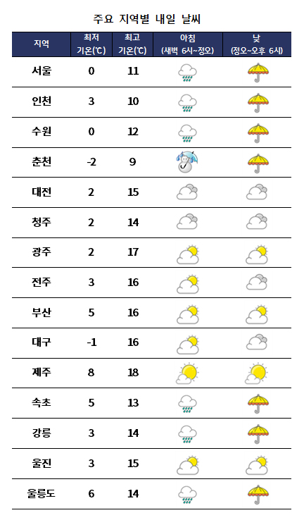 ±Ý¿äÀÏÀÎ ³»ÀÏ(15ÀÏ)Àº Àü±¹ÀÌ È帰 °¡¿îµ¥ ÁߺÎÁö¹æ¿¡ ºñ ¶Ç´Â ´«ÀÌ ³»¸®´Ù °³°Ú°í Ãʹ̼¼¸ÕÁö ³óµµµµ ¿ÀÈÄ ÇѶ§ ¡®³ª»Ý¡¯ ´Ü°è¸¦ º¸À̰ڴÙ. ¹Î°£±â»ó±â¾÷ ÄÉÀÌ¿þ´õ´Â ¡°³»ÀÏ ÁߺÎÁö¹æÀº ºÏ¼ÂÊ¿¡¼ ´Ù°¡¿À´Â ±â¾Ð°ñÀÇ ¿µÇâÀ» ¹Þ°Ú°í, ³²ºÎÁö¹æÀº ³²ÇØ»ó¿¡ À§Ä¡ÇÑ °í±â¾ÐÀÇ °¡ÀåÀÚ¸®¿¡ µé°Ú´Ù¡±°í ÀüÇß´Ù. ÀÌ¾î ¡°ÁߺÎÁö¹æÀº »õº®ºÎÅÍ ³· µ¿¾È ºñ°¡ ¿Â ÈÄ Á¡Â÷ °³°Ú°í ³²ºÎÁö¹æÀº ´ëü·Î È帮°Ú´Ù¡±¸ç ¡°ºñ°¡ ³»¸®´Â µ¿¾È ±â¿ÂÀÌ ³·Àº °æ±âµ¿ºÎ¿Í °¿ø¿µ¼, °¿ø»ê°£¿¡´Â ´«ÀÌ ¿À´Â °÷µµ ÀÖ°Ú´Ù¡±°í ¿¹º¸Çß´Ù. * ¿¹»ó °¼ö·®(15ÀÏ) - ÁߺΠ: 5mm³»¿Ü * ¿¹»ó Àû¼³(15ÀÏ) - °æ±âµ¿ºÎ, °¿ø¿µ¼, °¿ø»ê°£ : 1~3cm ¾ÆÄ§ ÃÖÀú±â¿ÂÀº -2¡É¿¡¼ 8¡É, ³· ÃÖ°í±â¿ÂÀº 9¡É¿¡¼ 18¡É·Î ¾ÆÄ§¿¡ Æò³âº¸´Ù ³·°Ú°í, ³·¿¡´Â Æò³â°ú ºñ½ÁÇÑ ¼öÁØÀÌ µÇ°Ú´Ù. ±â¿ÂÀÌ ¶³¾îÁö¸é¼ ³»¸° ´«À̳ª ºñ°¡ ¾ó¾î µµ·Î°¡ ¹Ì²ô·¯¿î °÷ÀÌ ÀÖ°ÚÀ¸´Ï Ãâ±Ù±æ ±³Åë¾ÈÀü¿¡ °¢º°È÷ À¯ÀÇÇØ¾ß°Ú´Ù