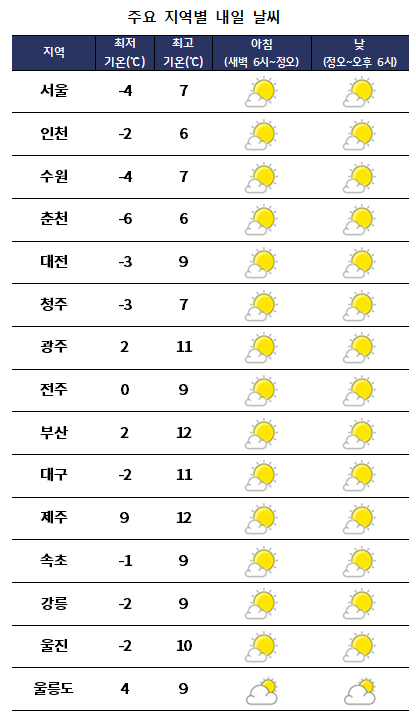 ¼ö¿äÀÏÀÎ ³»ÀÏ(20ÀÏ)Àº Àü±¹ÀÌ ´ëü·Î ¸¼Àº °¡¿îµ¥ Âù¹Ù¶÷ÀÌ ºÒ¸ç ü°¨¿Âµµ°¡ ³·¾Æ Ãä°Ú´Ù. ¹Î°£±â»ó±â¾÷ ÄÉÀÌ¿þ´õ´Â ¡°³»ÀÏ(19ÀÏ) ¿ì¸®³ª¶ó´Â ¼Çػ󿡼 µ¿ÁøÇÏ´Â °í±â¾ÐÀÇ ¿µÇâÀ» ¹Þ°Ú´Ù¡±¸ç ¡°Àü±¹ÀÌ ´ëü·Î ¸¼Àº °¡¿îµ¥ ¿ï¸ªµµ¿Í µ¶µµ´Â ±¸¸§ÀÌ ¸¹°Ú´Ù¡±°í ¿¹º¸Çß´Ù. ¾ÆÄ§ ÃÖÀú±â¿ÂÀº –6¡É¿¡¼ 9¡É, ³· ÃÖ°í±â¿ÂÀº 6¡É¿¡¼ 13¡É°¡ µÇ°Ú´Ù. ¸ð·¹(21ÀÏ)±îÁö ÁߺÎÁö¹æ°ú ³²ºÎ³»·úÁö¹æÀÇ ¾ÆÄ§ ±â¿ÂÀº ¿µÇϱǿ¡ µé°Ú°í, ¹Ù¶÷ÀÌ ºÒ¸é¼ ü°¨¿Âµµ´Â ´õ ³·°Ú´Ù.
