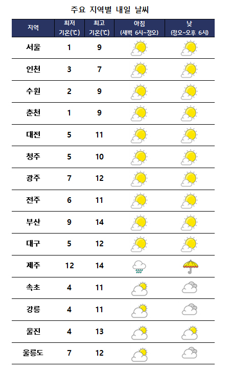 ¼ö¿äÀÏÀÎ ³»ÀÏ(27ÀÏ)Àº Àü±¹ÀÌ ´ëü·Î ¸¼°ÚÁö¸¸ ¿µµ¿°ú Á¦ÁÖµµ¿¡ ºñ ¶Ç´Â ´«ÀÌ ¿À´Â °÷ÀÌ ÀÖ°Ú´Ù. ¹Î°£±â»ó±â¾÷ ÄÉÀÌ¿þ´õ´Â ¡°³»ÀÏ(27ÀÏ) ¿ì¸®³ª¶ó´Â Áß±¹ ºÏºÎÁö¹æ¿¡¼ ³²µ¿ÁøÇÏ´Â °í±â¾ÐÀÇ ¿µÇâÀ» ¹Þ°Ú´Ù¡±¸ç ¡°Àü±¹ÀÌ ±¸¸§ÀÌ ¸¹´Ù°¡ Á¡Â÷ ¸¼¾ÆÁö°ÚÀ¸³ª, °¿ø¿µµ¿°ú °æ»ó µ¿ÇؾÈÀº µ¿Ç³ÀÇ ¿µÇâÀ¸·Î Â÷Â÷ Èå·ÁÁö°Ú´Ù¡±°í ¿¹º¸Çß´Ù. ÀÌ¾î ¡°Àú³áºÎÅÍ °¿ø¿µµ¿Àº ´« ¶Ç´Â ºñ°¡ ¿À´Â °÷ÀÌ ÀÖ°Ú°í, °æ»ó µ¿ÇؾÈÀº ºñ°¡ ¿À°Ú´Ù. Á¦ÁÖµµ´Â ³· ÇѶ§ ºñ°¡ ¿Â ÈÄ °³°Ú´Ù¡±°í ÀüÇß´Ù. * ¿¹»ó °¼ö·®(~28ÀÏ) - °¿ø¿µµ¿ : 20~60mm - °æ»ó µ¿ÇØ¾È : 5~30mm - Á¦ÁÖµµ : 5mm³»¿Ü * ¿¹»ó Àû¼³(~28ÀÏ) - °¿ø»ê°£ : 10~30cm - °¿ø µ¿ÇØ¾È : 1~5cm ¾ÆÄ§ ÃÖÀú±â¿ÂÀº 1¡É¿¡¼ 12¡É, ³· ÃÖ°í±â¿ÂÀº 7¡É¿¡¼ 14¡É·Î Æò³â°ú ºñ½ÁÇÑ ±â¿Â ºÐÆ÷¸¦ º¸À̰ڴÙ.