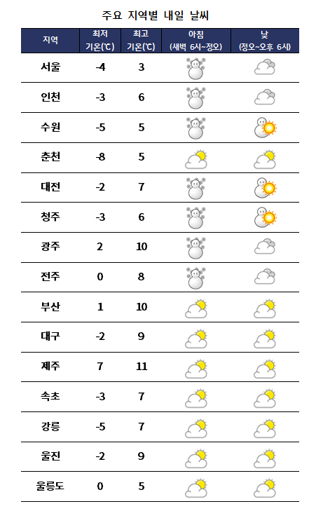 ¿Â¶óÀÎÄ¿¹Â´ÏƼ µî¿¡ õ¾È¿¡ ´«ÀÌ ¸¹ÀÌ ³»¸®°í ÀÖ´Ù´Â ±ÛÀÌ °ÔÀçµÇ°í ÀÖ´Ù. È¿äÀÏÀÎ ³»ÀÏ(3ÀÏ)±îÁö ¼öµµ±Ç°ú ÃæÃ»µµ, Àü¶óµµ µî¿¡ ´«ÀÌ ³»¸®°Ú°í, Âù °ø±â°¡ À¯ÀÔµÇ¸é¼ ´ëºÎºÐ Áö¿ªÀÌ ¾ÆÄ§ ±â¿ÂÀÌ ¿µÇϱǿ¡ µé°Ú´Ù. ¹Î°£±â»ó±â¾÷ ÄÉÀÌ¿þ´õ´Â ¡°³»ÀÏ ¿ì¸®³ª¶ó´Â ÁߺÎÁö¹æ¿¡ À§Ä¡ÇÑ °í±â¾ÐÀÇ °¡ÀåÀÚ¸®¿¡ µé°Ú´Ù¡±¸ç ¡°Àü±¹ ´ëºÎºÐ Áö¿ª¿¡ ±¸¸§ÀÌ ¸¹Àº °¡¿îµ¥ ¼¿ï°ú °æ±âºÏºÎ, Àü¶óµµ´Â ¿ÀÀü¿¡ ´« ¿Â ÈÄ °³°Ú°í, °æ±â³²ºÎ¿Í ÃæÃ»µµ´Â ³·±îÁö ´«ÀÌ ¿À´Ù°¡ ±×Ä¡°Ú´Ù¡±°í ¿¹º¸Çß´Ù. * ¿¹»ó °¼ö·®(~3ÀÏ) - Ãæ³², ÀüºÏ : 5mm³»¿Ü - ¼¿ï, °æ±â, ÃæºÏ, Àü³²ºÏºÎ : 5mm¹Ì¸¸ * ¿¹»ó Àû¼³·®(~3ÀÏ) - Ãæ³², ÀüºÏ : 3~8cm - °æ±â³²ºÎ, ÃæºÏ, Àü³²ºÏºÎ : 1~5cm - ¼¿ï, °æ±âºÏºÎ : 1cm³»¿Ü ¿À´Ã(2ÀÏ) ¹ãºÎÅÍ ³»ÀÏ(3ÀÏ) »çÀÌ¿¡ Ãæ³²°ú ÀüºÏÀ» Áß½ÉÀ¸·Î ¸¹Àº ´«ÀÌ ³»¸®´Â °÷ÀÌ ÀÖ°Ú°í, °æ±â³²ºÎ¿Í ÃæºÏ, Àü³²ºÏºÎ¿¡¼µµ ´«ÀÌ ³»·Á ½×ÀÌ´Â °÷ÀÌ ÀÖ°Ú´Ù. ´«ÀÌ ³»¸®´Â Áö¿ª¿¡¼´Â ³»¸° ´«ÀÌ ¾ó¾î µµ·Î°¡ ¹Ì²ô·¯¿î °÷ÀÌ ¸¹°ÚÀ¸´Ï ±³Åë¾ÈÀü¿¡ °¢º°È÷ À¯ÀÇÇØ¾ß°Ú´Ù. ¾ÆÄ§ ÃÖÀú±â¿ÂÀº –8¡É¿¡¼ 7¡É, ³· ÃÖ°í±â¿ÂÀº 3¡É¿¡¼ 11¡É·Î Æò³âº¸´Ù 1~3¡É°¡·® ³·°Ú´Ù. Âù °ø±â°¡ À¯ÀÔµÇ¸é¼ ¾ÆÄ§¿¡ ¿µÇÏ·Î ¶³¾îÁö´Â °÷ÀÌ ¸¹°Ú°í, ¹Ù¶÷ÀÌ °ÇÏ°Ô ºÒ¸ç ü°¨¿Âµµ´Â ´õ¿í ³·¾Æ Ãä°Ú´Ù. ³»ÀÏ(3ÀÏ)±îÁö ÀüÇØ»ó¿¡ ¹Ù¶÷ÀÌ °ÇÏ°Ô ºÒ¸é¼ ¹Ù´ÙÀÇ ¹°°áÀº ¼ÇØ¿Í ³²Çػ󿡼 0.5~3m, µ¿Çػ󿡼 0.5~5m·Î ³ô°Ô ÀϰڴÙ. ´ë±â ¼øÈ¯ÀÌ ¿øÈ°ÇØ ¹Ì¼¼¸ÕÁö ³óµµ´Â Àü±¹ÀÌ ¡®ÁÁÀ½¡¯ ¶Ç´Â ¡®º¸Å롯 ´Ü°è¸¦ º¸À̰ڴÙ. ÇÑÆí À̹ø ÁÖ´Â ±â¾Ð°ñÀÇ ¿µÇâÀ¸·Î 4ÀÏ °¿ø¿µµ¿À» Á¦¿ÜÇÑ ÁߺϺÎÁö¹æ°ú ÃæÃ»ºÏºÎÁö¿ª¿¡ ´«ÀÌ ¿À°Ú°í, 7ÀÏÀº ÁߺÎÁö¹æ¿¡ ´«ÀÌ ³»¸®°Ú´Ù.