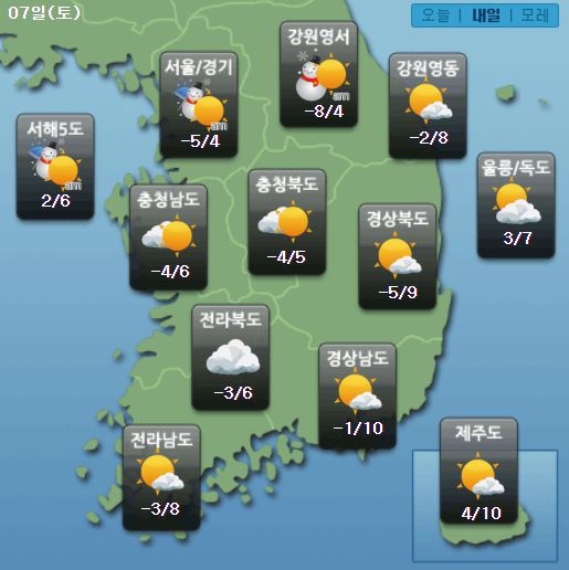 ±â¿ÂÀÌ ¿À¸£¸é¼ Åä¿äÀÏ(7ÀÏ) ¾ÆÄ§ ±â¿ÂÀº –5¡É¿¡¼ 4¡É, ³· ±â¿ÂÀº 4¡É¿¡¼ 10¡É°¡ µÇ°Ú´Ù. ¿À´Ãº¸´Ù 5~7¡É°¡·® ³ô°ÚÀ¸³ª, Áߺγ»·úÀ» Áß½ÉÀ¸·Î -10¡É ³»¿ÜÀÇ ±â¿ÂÀ» º¸ÀÌ´Â °÷µµ ÀÖ°Ú´Ù. ÀÏ¿äÀÏ(8ÀÏ)Àº ¾ÆÄ§±îÁö Æò³âº¸´Ù 2~3¡É ³·Àº ±â¿ÂºÐÆ÷¸¦ º¸ÀÌ´Ù Á¡Â÷ Æò³â ¼öÁØÀ» ȸº¹ÇϰڴÙ. ÀϺΠÁö¿ª¿¡ °ÇÁ¶Æ¯º¸°¡ ¹ßÈ¿ ÁßÀÎ °¡¿îµ¥ ±× ¹ÛÀÇ Áö¿ªµµ Â÷Â÷ °ÇÁ¶ÇØÁö°ÚÀ¸´Ï, »êºÒ µî °¢Á¾ ÈÀ翹¹æ¿¡ °¢º°È÷ À¯ÀÇÇØ¾ß°Ú´Ù. ¹Ì¼¼¸ÕÁö ³óµµ´Â Àü±¹ ´ë±â ¼øÈ¯ÀÌ ¿øÈ°ÇØ ¡®º¸Å롯 ´Ü°è°¡ µÇ°Ú´Ù. ¹Ù´ÙÀÇ ¹°°áÀº ¼ÇØ¿Í ³²Çػ󿡼 0.5~2m, µ¿Çػ󿡼 ÃÖ°í 4m·Î ³ô°Ô ÀϰڴÙ. µ¿ÇØÁߺθչٴٴ ¹Ù¶÷ÀÌ Â÷Â÷ °ÇÏ°Ô ºÒ¸é¼ dz¶ûƯº¸°¡ ¹ßÇ¥µÉ °¡´É¼ºÀÌ ÀÖ°Ú´Ù. ÇÑÆí ´ÙÀ½ ÁÖ´Â ±â¾Ð°ñÀÇ ¿µÇâÀ¸·Î 10ÀÏ ÁߺÎÁö¹æ¿¡ ºñ ¶Ç´Â ´«ÀÌ ¿À°Ú´Ù. ±× ¹ÛÀÇ ³¯Àº ´ëü·Î ±¸¸§¸¸ ¸¹°Ú´Ù.  Åä¿äÀÏ ³¯¾¾ Àü¸Á(ÀÚ·áÁ¦°ø=ÄÉÀÌ¿þ´õ)