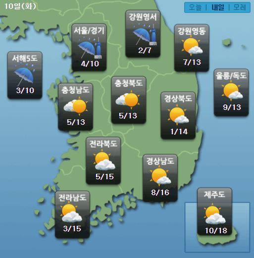 È¿äÀÏÀÎ ³»ÀÏ(9ÀÏ) ÁߺϺÎÁö¹æ¿¡ »õº® ÇѶ§ ºñ°¡ ³»¸®°Ú°í, ¹Ì¼¼¸ÕÁö ³óµµ°¡ ³ô°Ô ³ªÅ¸³ª°Ú´Ù. ¹Î°£±â»ó±â¾÷ ÄÉÀÌ¿þ´õ´Â ¡°³»ÀÏ ¿ì¸®³ª¶ó´Â ³²ÇØ»óÀ» Áö³ª´Â °í±â¾ÐÀÇ ¿µÇâÀ» ¹Þ°Ú°í, ÁߺϺÎÁö¹æÀº ºÏÂÊÀ» Áö³ª´Â ±â¾Ð°ñÀÇ ¿µÇâÀ» ¹Þ°Ú´Ù¡±¸ç ¡°°æ±âºÏºÎ´Â »õº®(~03½Ã)¿¡ ºñ°¡ ±×Ä£ µÚ ¹ã(21½Ã)ºÎÅÍ ´Ù½Ã ºñ°¡¿À°Ú´Ù¡±°í ¿¹º¸Çß´Ù. ÀÌ¾î ¡°¼¿ï°ú °æ±â³²ºÎ, °¿ø¿µ¼´Â »õº®(03½Ã)¿¡ ºñ°¡ ±×Ä£ µÚ ±¸¸§ÀÌ ¸¹°Ú´Ù¡±¸ç ¡°ÃæÃ»À̳²°ú °¿ø¿µ¼Áö¹æÀº ´ëü·Î ¸¼°Ú´Ù¡±°í ÀüÇß´Ù. ¾ÆÄ§ ÃÖÀú±â¿ÂÀº 1¡É¿¡¼ 10¡É, ³· ÃÖ°í±â¿ÂÀº 7¡É¿¡¼ 18¡É·Î Æò³âº¸´Ù 1~5¡É °¡·® ³ô°Ô ³ªÅ¸³ª°Ú´Ù. ¿À´Ã ¹ãºÎÅÍ ±¹¿Ü¿¡¼ ¹Ì¼¼¸ÕÁö°¡ Ãß°¡ÀûÀ¸·Î À¯ÀÔµÇ¸é¼ ¹Ì¼¼¸ÕÁö ³óµµ´Â Àü±¹ÀÌ ¡®³ª»Ý¡¯ ´Ü°è¸¦ º¸À̰ڴÙ. ¼ÂÊÁö¹æÀº ¡®¸Å¿ì ³ª»Ý¡¯ ´Ü°è±îÁö ¿Ã¶ó°¥ °¡´É¼ºµµ ÀÖ°Ú´Ù. °ÇÁ¶Æ¯º¸°¡ ¹ßÈ¿ ÁßÀÎ °¿øµµ¿Í °æ»óµµ ÀϺΠÁö¿ª¿¡´Â ³»ÀÏ(10ÀÏ)±îÁö ¹Ù¶÷ÀÌ °ÇÏ°Ô ºÒ°ÚÀ¸´Ï »êºÒ µî °¢Á¾ ÈÀ翹¹æ¿¡ °¢º°È÷ À¯ÀÇÇÏ´Â °ÍÀÌ ÁÁ°Ú´Ù. ÇÑÆí ¼ö¿äÀÏ(11ÀÏ)°ú Åä¿äÀÏ(14ÀÏ)Àº ±â¾Ð°ñÀÇ ¿µÇâÀ¸·Î ÁߺÎÁö¹æÀ» Áß½ÉÀ¸·Î ºñ ¶Ç´Â ´«ÀÌ ¿À°Ú°í, ¼ö¿äÀÏ(11ÀÏ) ºñ°¡ ±×Ä£ ÈÄ ¶Ç´Ù½Ã ºÏ¼ÂÊ¿¡ Âù °ø±â°¡ ³²ÇÏÇÏ¸é¼ Ãß¿öÁö°Ú´Ù.  ÁÖ¿ä Áö¿ªº° È¿äÀÏ(10ÀÏ) Àϱ⵵ (ÀÚ·áÁ¦°ø=ÄÉÀÌ¿þ´õ)