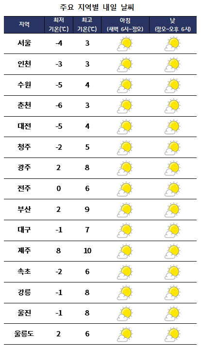 ¸ñ¿äÀÏÀÎ ³»ÀÏ(12ÀÏ)Àº Âù¹Ù¶÷ÀÌ ºÒ¸ç Àü±¹ÀÇ ¾ÆÄ§ ±â¿ÂÀÌ ¿µÇϱǿ¡ µé°ÚÀ¸³ª ¹Ì¼¼¸ÕÁö´Â ÇØ¼ÒµÅ ÇÏ´ÃÀº ¸¼°Ú´Ù. ¹Î°£±â»ó±â¾÷ ÄÉÀÌ¿þ´õ´Â ¡°³»ÀÏ(12ÀÏ) ¿ì¸®³ª¶ó´Â Áß±¹ ºÏºÎÁö¹æ¿¡¼ ³²ÇÏÇÏ´Â °í±â¾ÐÀÇ °¡ÀåÀÚ¸®¿¡ µé¾î Àü±¹ÀÌ ´ëü·Î ¸¼°Ú´Ù¡±¸ç ¡°¾ÆÄ§¿¡ Àü±¹ ³»·úÀ» Áß½ÉÀ¸·Î ±â¿ÂÀÌ ¿µÇÏ·Î ¶³¾îÁö°í ¹Ù¶÷µµ °ÇÏ°Ô ºÒ¾î ü°¨¿Âµµ´Â ´õ¿í ³·¾Æ Ãä°Ú´Ù¡±°í ¿¹º¸Çß´Ù. ºÏ¼ÂÊ¿¡¼ Âù °ø±â°¡ À¯ÀÔµÇ¸é¼ ³»ÀÏ(12ÀÏ) ¾ÆÄ§ ±â¿ÂÀº ¿À´Ãº¸´Ù 10¡ÉÀÌ»ó ¶³¾îÁ® –6¡É¿¡¼ 8¡ÉÀÇ ºÐÆ÷¸¦ º¸À̰ڴÙ. ³· ÃÖ°í±â¿ÂÀº 3¡É¿¡¼ 10¡É°¡ µÇ°ÚÀ¸³ª ¹Ù¶÷ÀÌ °ÇÏ°Ô ºÒ¾î ü°¨¿Âµµ´Â 3~5¡É °¡·® ´õ ³·°Ú´Ù.