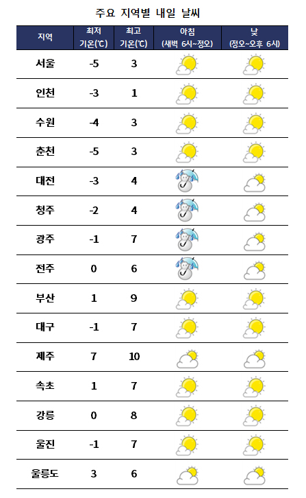±Ý¿äÀÏÀÎ ³»ÀÏ(20ÀÏ)Àº ÃæÃ»µµ¿Í Àü¶óµµ¿¡ ¿ÀÀü±îÁö ´« ¶Ç´Â ºñ°¡ ³»¸®°Ú°í, ÁߺΠ³»·úÀº ¾ÆÄ§ ±â¿ÂÀÌ ¿µÇϱǿ¡ µé°Ú´Ù. ¹Î°£±â»ó±â¾÷ ÄÉÀÌ¿þ´õ´Â ¡°³»ÀÏ(20ÀÏ) ¿ì¸®³ª¶ó´Â ¼ÇØ»ó¿¡ À§Ä¡ÇÑ °í±â¾ÐÀÇ ¿µÇâÀ» ¹Þ°Ú´Ù¡±¸ç ¡°Àü±¹¿¡ ±¸¸§ÀÌ ¸¹´Ù°¡ Á¡Â÷ ¸¼¾ÆÁö°Ú°í, ÃæÃ»µµ¿Í Àü¶óµµ´Â ´« ¶Ç´Â ºñ°¡ ¿À´Ù°¡ ¾ÆÄ§¿¡ ´ëºÎºÐ ±×Ä¡°Ú´Ù¡±°í ¿¹º¸Çß´Ù. * ¿¹»ó °¼ö·®(19~20ÀÏ) - ¼ÇØ5µµ, ÃæÃ»µµ, Àü¶óµµ : 5mm ³»¿Ü * ¿¹»ó Àû¼³·®(19~20ÀÏ) - ¼ÇØ5µµ, ÃæÃ»µµ, Àü¶óµµ : 1~5cm ¿À´Ã(19ÀÏ) ¹ãºÎÅÍ ³»ÀÏ(20ÀÏ) ¾ÆÄ§ »çÀÌ¿¡ ÃæÃ»µµ¿Í Àü¶óµµ´Â ´« ¶Ç´Â ºñ°¡ ³»¸®¸é¼ Áö¸éÀÌ ¾ó¾î ¹Ì²ô·´°ÚÀ¸´Ï ±³Åë¾ÈÀü¿¡ À¯ÀÇÇÏ´Â °ÍÀÌ ÁÁ°Ú´Ù. ¾ÆÄ§ ÃÖÀú ±â¿ÂÀº -5¡É¿¡¼ 7¡É, ³· ÃÖ°í±â¿ÂÀº 1¡É¿¡¼ 10¡É°¡ µÇ°Ú´Ù. ¸ð·¹(21ÀÏ)±îÁö ±â¿ÂÀº Æò³â°ú ºñ½ÁÇÑ ºÐÆ÷¸¦ º¸À̰ÚÀ¸³ª, Áߺγ»·ú°ú ÀϺΠ³²ºÎ³»·úÀ» Áß½ÉÀ¸·Î ¾ÆÄ§¿¡ ±â¿ÂÀÌ -5¡É ÀÌÇÏ·Î ¶³¾îÁö°Ú´Ù.